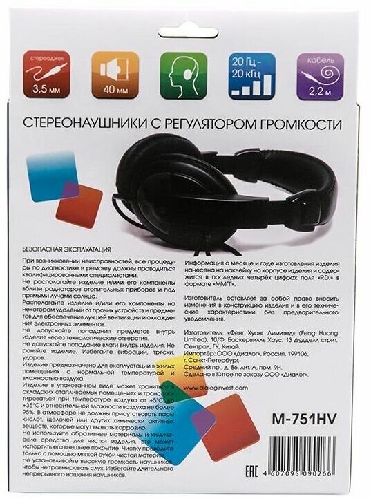 Dialog М-751HV - полноразмерные стереонаушники с индивидуальным регулятором громкости, проводом в тканевой оплётке повышенной прочности, длиной 2.2 метра. Эти наушники отличаются хорошим качеством звука. Диапазон воспроизводимых частот 20 - 20000 Гц. Мягкое и лёгкое регулируемое оголовье и мягкие амбушюры из качественного кожезаменителя сделает прослушивание Ваших фонограмм комфортным и неутомительным.