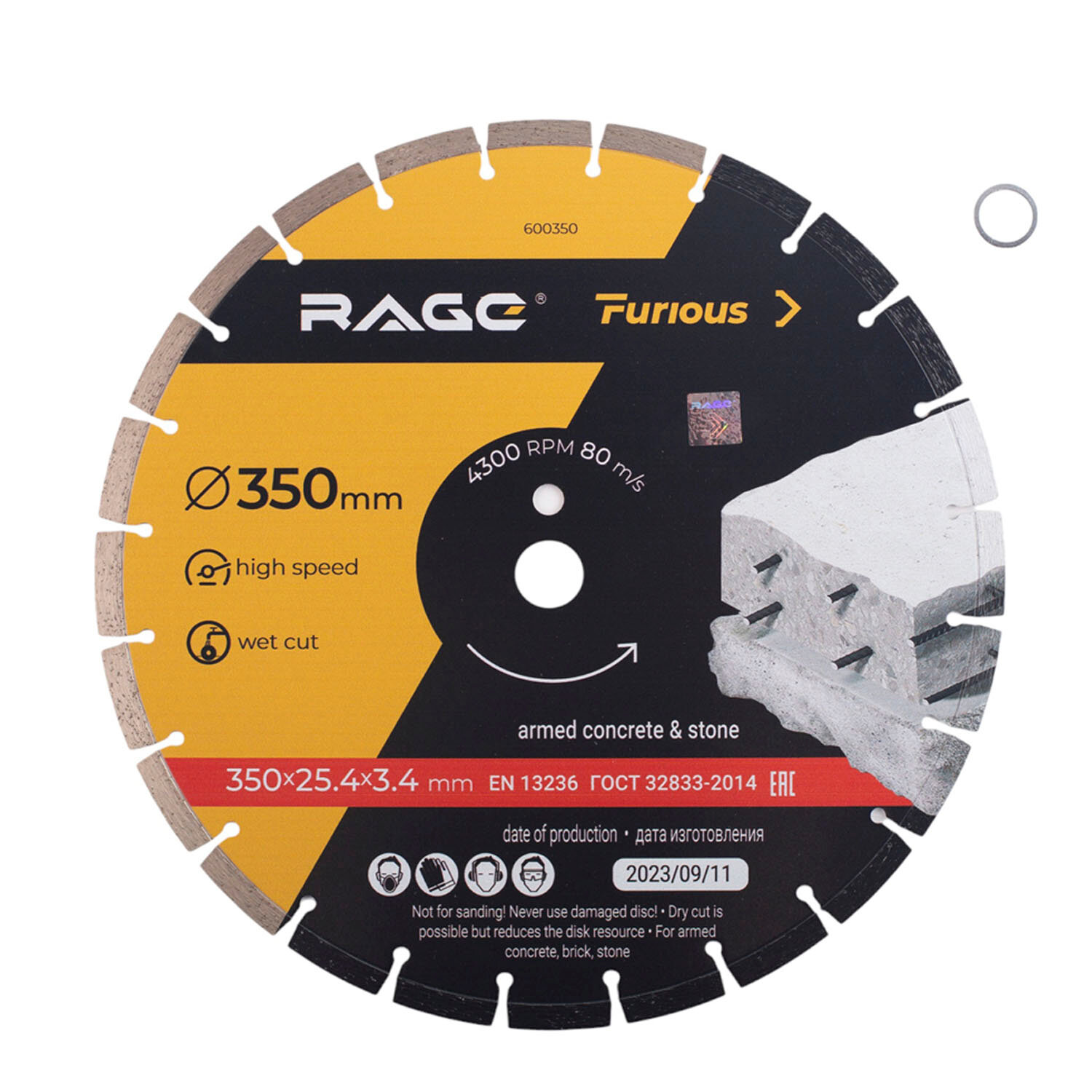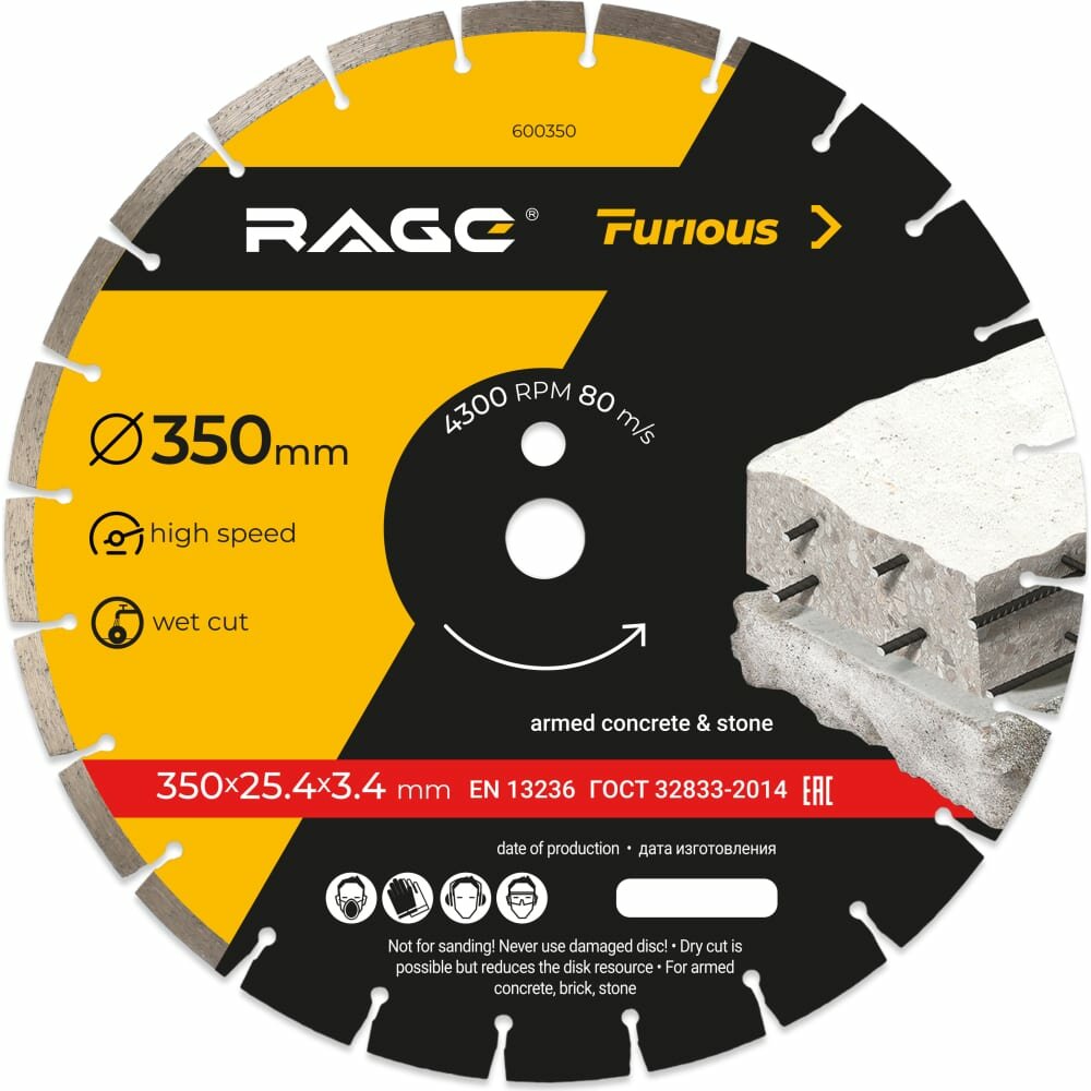 Диск алмазный сегментный по железобетону и камню Rage 600129 350x22.23x3.4 мм