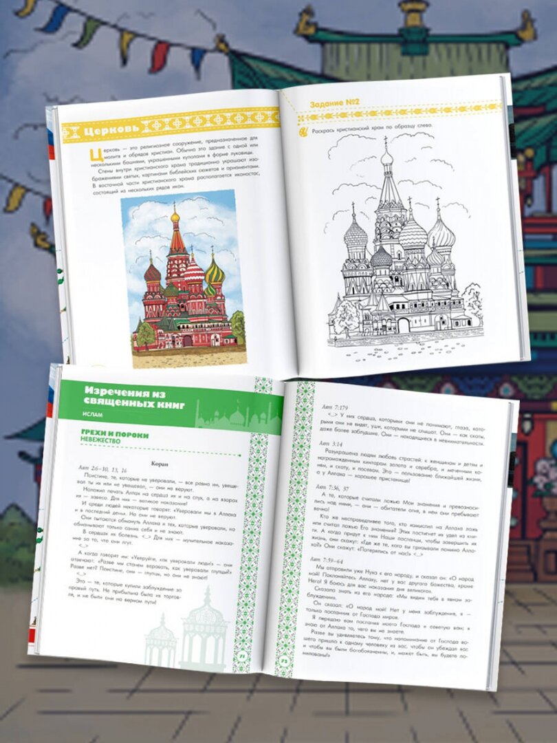В первую очередь скажу, что материал в этой книге представлен довольно деликатно, простыми фразами и отпредилениями. Но, как по мне, информацию можно было бы слегка расширить, поскольку те же самые определения не дают полную картину видения и у ребенка появляется больше вопросов, ответов на которые в этой книге, к сожалению, нет. Книга красочная, яркая. Ребенку понравились раскраски, но не идея раскрашивать по шаблону, поэтому она сама выбирала как будуть выглядеть храмы. Мне как родителю нравится идея просвещения ребенка в разных аспектах, в том числе в вопросе существующих религий. Порекомендую эту книгу как источник общего развития, но на многие Почему? придется все же отвечать родителям.