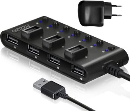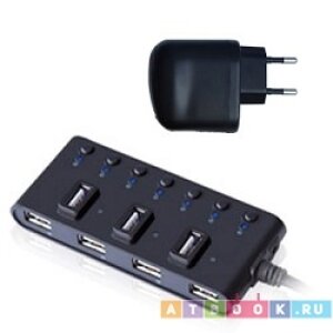 Хороший хаб, за небольшие деньги. 7 портов, + доп-питание. Сдвоенный хвост втыкается в компьютер, на коробке хаба - 7 портов (с кнопками включения\выключения), в которые можно воткнуть все что угодно, вплоть до USB-HDD (2 штуки работают нормально, больше не проверял). Провод достаточно длинный, чтоб более-менее удобно разместить хаб на столе. За такие деньги, большего требовать, - глупо.