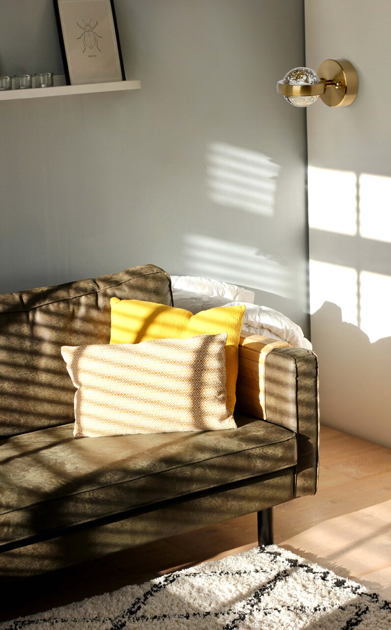 Основание светильника выполнено из сплава алюминия с цинком, обработано по технологии брашинга и гальванизировано в цвет медовой бронзы. Светодиодный источник света закрыт сферой из стекла с включениями пузырьков.