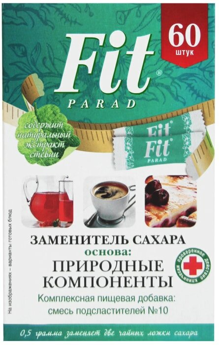 Новая, более удобная упаковка для разового употребления - пакетик-стик.Инновационный низкокалорийный заменитель сахара на основе природных компонентов.Заменитель сахара ФитПарад № 10 можно использовать для приготовления десертов и сладких напитков, а также добавлять в каши и другие блюда, принимая во внимание то, что продукт слаще сахара в 10 раз.Подсластитель безопасен для больных диабетом и может использоваться в диетическом питании людей, страдающих лишним весом. Кроме того, спортсмены и сторонники здорового питания также являются потребителями данного продукта. Попробуйте и Вы!Состав: эритрит, топинамбур, сукралоза, стевиозид.Внимание! 1 пакетик-стик- 0.5 гВ пачке 60 пакетиков.Рекомендации по применению: 0.5 г смеси "ФитПарад" №10 заменяет 5 г сахара. Дозировка: не более 45 г в сутки. Один пакетик саше заменит 1 чайную ложку сахара.