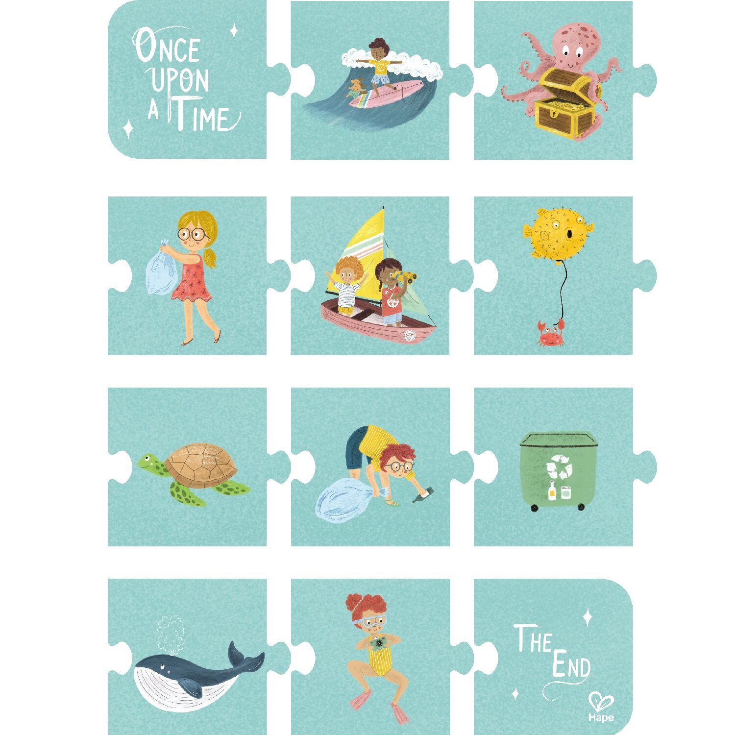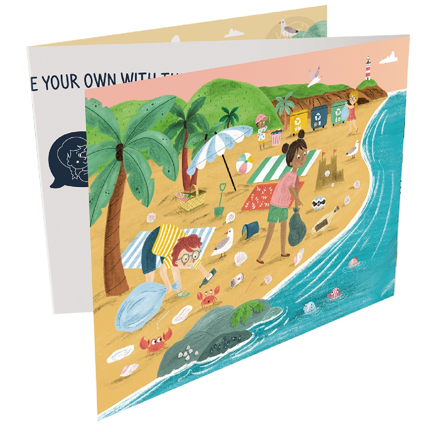 Соберите с ребёнком все картинки по очереди, затем придумайте вместе историю про чудесный отдых на берегу океана и про знакомство с его обитателями. Расскажите о том, как важно сохранять чистоту океана и природы в целом.