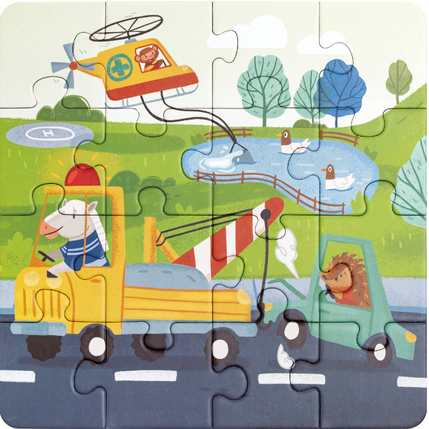 Набор пазлов для малышей Спасательные машины (5 в 1). Это яркая серия пазлов, которая направлена на обучение ребёнка, развитие у него логического мышления, внимания и цветового восприятия. Набор включает четыре сборные картинки со спасательными машинами (пожарная, скорая помощь, полицейская и эвакуатор), каждая из которых состоит из 16 элементов, а также комплект пазлов для создания собственной истории (12 элементов). Мешочек для хранения деталей в комплекте.