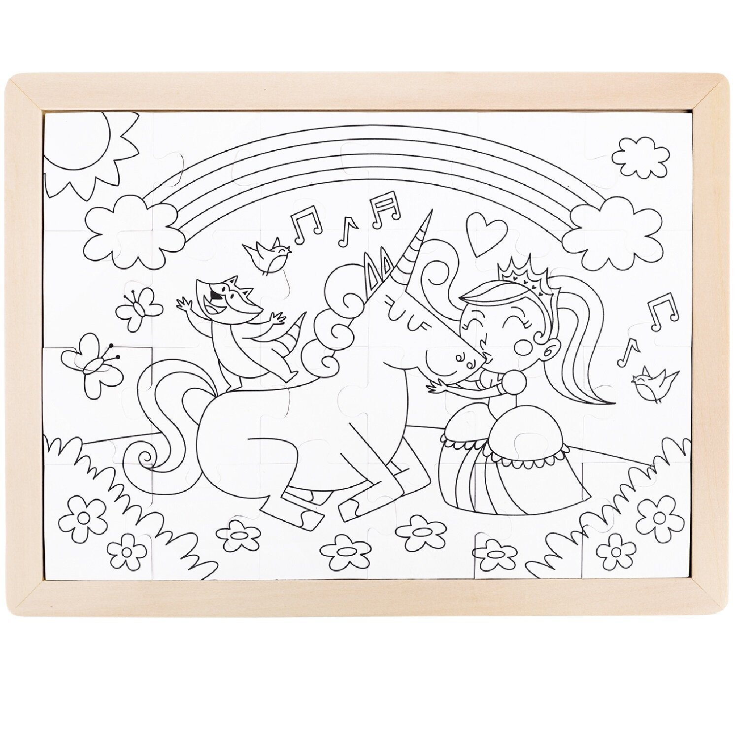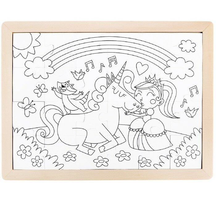 Пазл-раскраска для малышей Единорог и принцесса – вместе навсегда - в рамке. Это сборная иллюстрация из 24 элементов с одной стороны и занимательная раскраска с другой. Подходит для раскрашивания акварелью, цветными карандашами, красками, фломастерами и, даже, пальчиками. Соберите с ребёнком яркую картинку, затем переверните её, и вы обнаружите новую картинку с контурами для раскрашивания. Ваш малыш вместе с вами окунётся в мир сказки, сам выберет цвета для сказочных героев и природы вокруг.