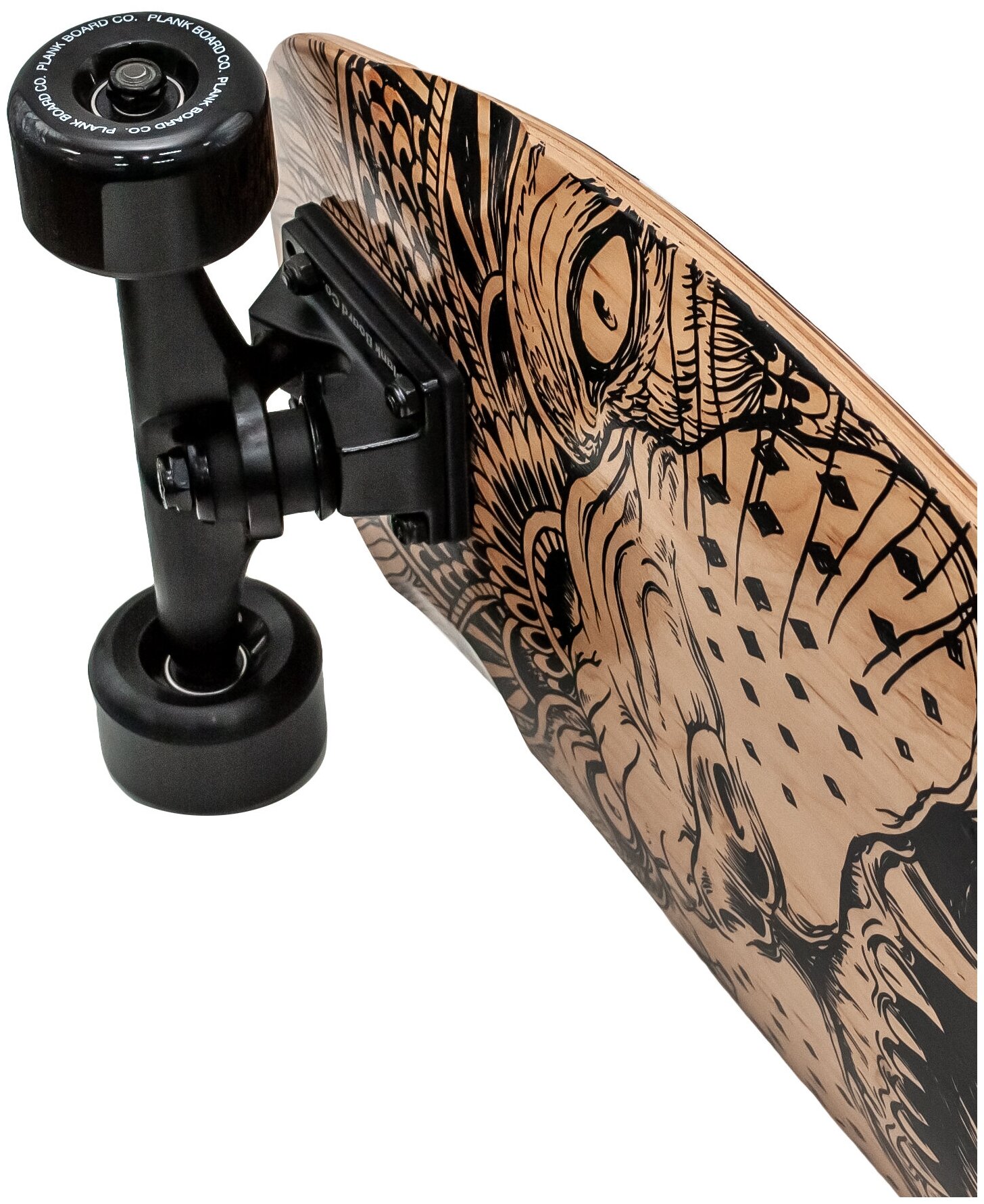 Материал деки состоит из 7 слоев канадского клена. Классические алюминиевые 6-ти дюймовые подвески сжесткостью бушингов SHR90A гармонично сочетаются с колёсами диаметром 60х40 мм. средней жесткости SHR78А с надежными и плавными подшипниками АВЕС-7 из хромированной стали.