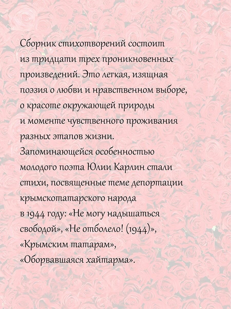 Запоминающейся особенностью молодого поэта Юлии Карлин стали стихи, посвященные теме депортации крымскотатарского народа в 1944 году: "Не могу надышаться свободой", "Не отболело! (1944)", "Крымским татарам", "Оборвавшаяся хайтарма". Для широкого круга читателей.