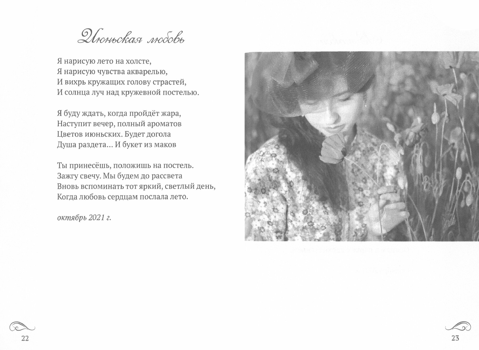 Сборник стихотворений состоит из тридцати трех проникновенных произведений. Это легкая, изящная поэзия о любви и нравственном выборе, о красоте окружающей природы и моменте чувственного проживания разных этапов жизни.