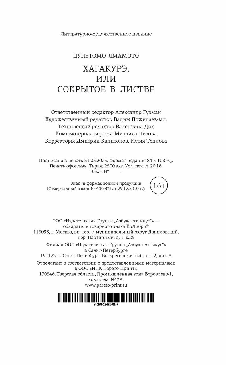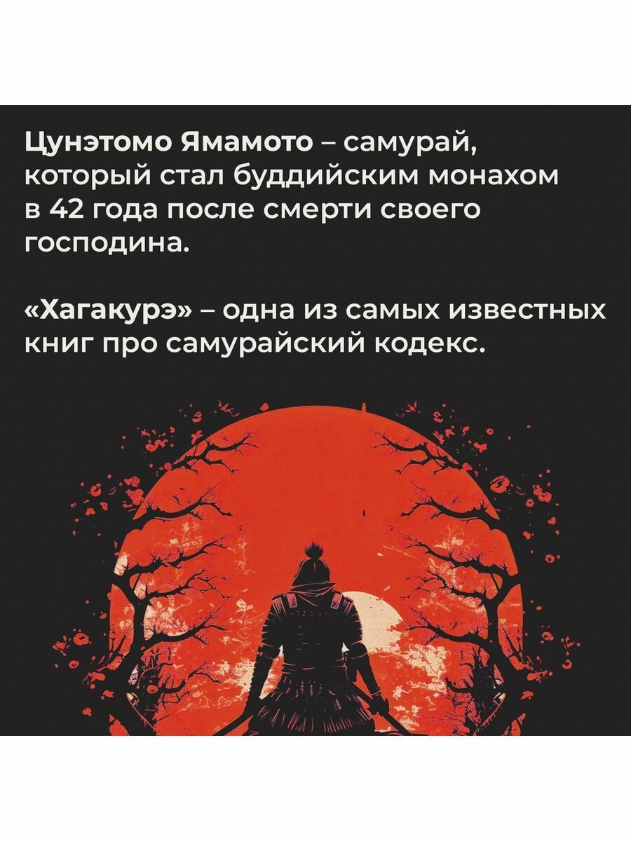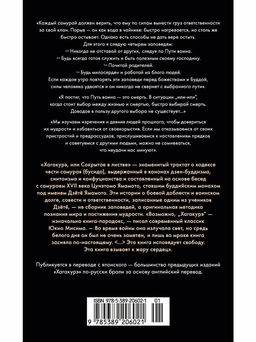 И наконец-то кто-то перевел Хагакуре на русский язык именно с японского оригинала, а не с английского перевода! Потому что какой бы хороший не был художественный перевод, а с него повторно переводить все же не стоит, - неминуемо получается \"испорченный телефон\", теряются оригинальные смыслы, стирается культурный контекст. Потрясающе, что теперь культовый исторический трактат - кодекс чести самураев наконец-то издан у нас в таком достойном исполнении! Не только содержание, но и верстка на высоте! Однозначно стоит того, чтобы быть у всех любителей Японии в коллекции!