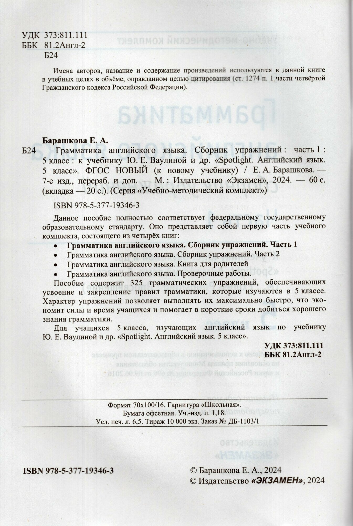 Spotlight. Грамматика английского языка. 5 класс. Сборник упражнений. Часть 1. К учебнику Ю.Е. Ваулиной и др. "Spotlight... (Барашкова Елена Александровна); Экзамен Издательство, 2023