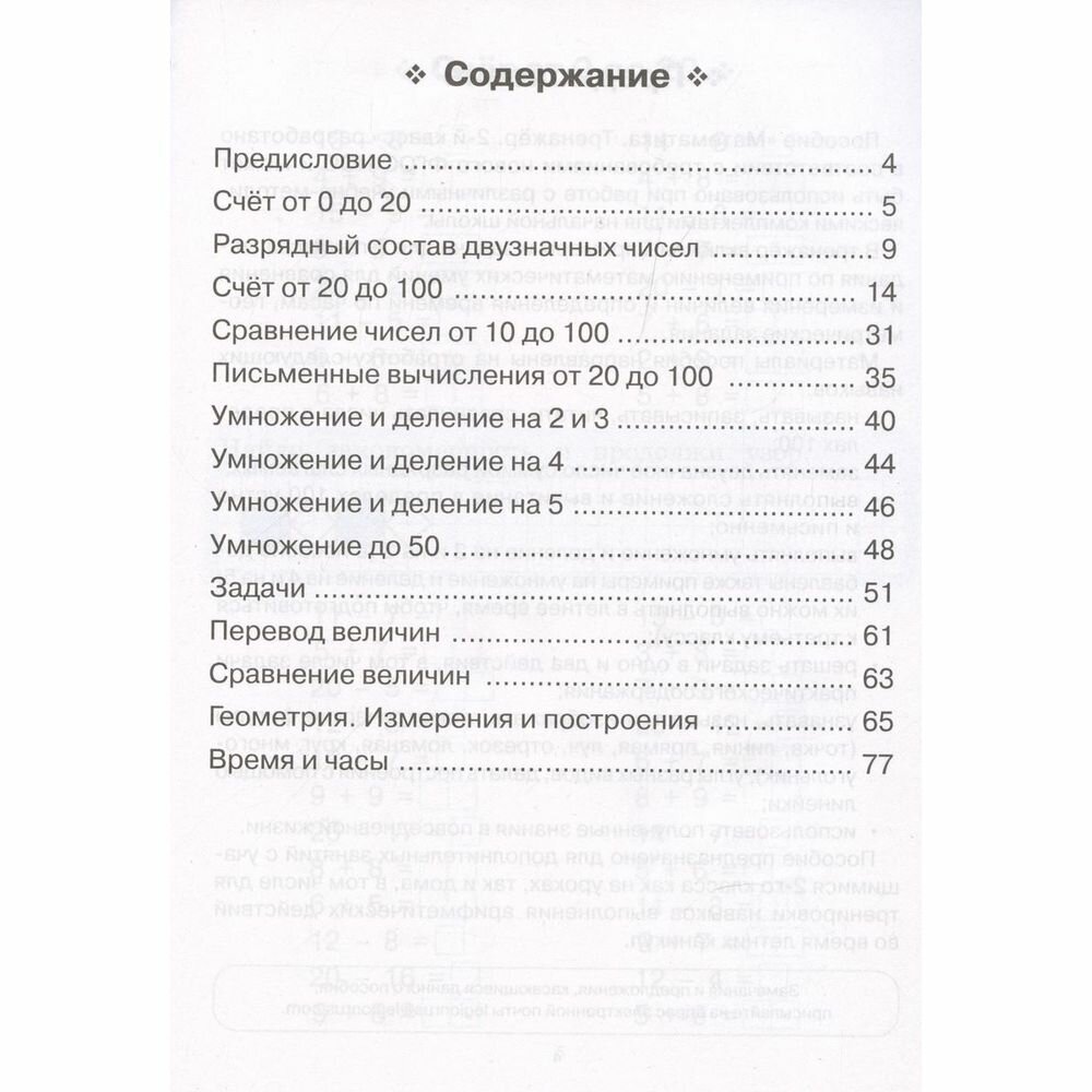 Наше пособие предназначено для отработки навыков счёта в пределах от 0 до 100. Тренажёр содержит задания по математике для 2-го класса с учётом требований нового ФГОС НОО. В пособие вошли различные виды примеров и задач, геометрические задания и задания на определение времени.