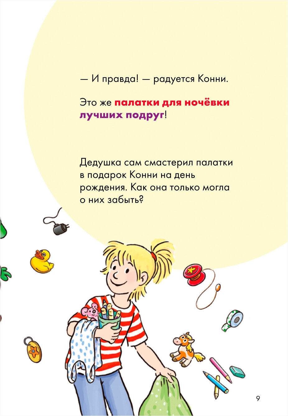 Скоро в гости приедет Юлия — с ней Конни была не разлей вода, пока не пришлось переехать в другой дом. Конни ужасно рада, ведь она давно не видела подругу детства. Вот только ее школьная подруга, Анна, ужасно ревнует. Девочки даже сильно ссорятся. Удастся ли им сохранить дружбу? Возможно, ночёвка в саду под звёздным небом поможет им помириться?