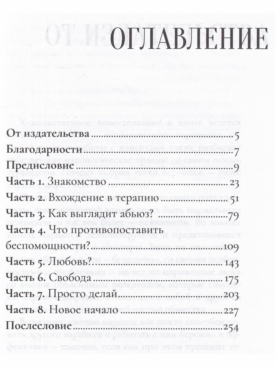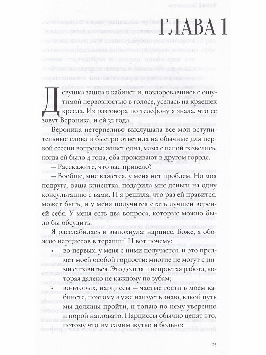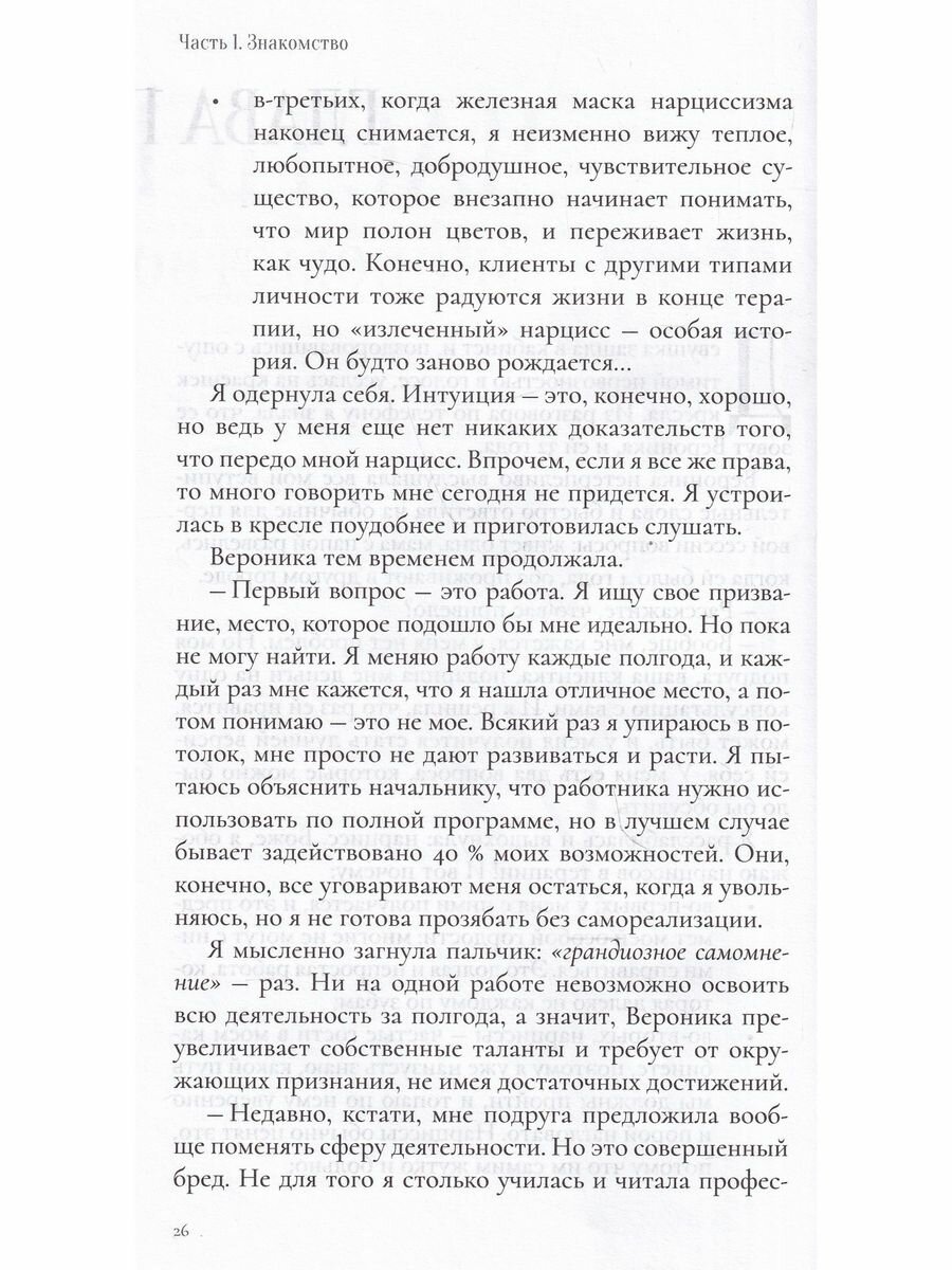 В книге описана психотерапевтическая работа с нарциссами и «жертвами нарциссов» на примерах историй двух клиентов и их психотерапевта. Автор рассматривает проблему с разных сторон: снаружи, с точки зрения психолога, и изнутри, с точки зрения клиентов — нарциссов и людей, находящихся внутри нездоровых отношений. Все это подается не в форме сухой теории, а на живых конкретных примерах, с описанием психотерапевтических сессий, объединенных общим сюжетом. Герои предстают перед нами обыкновенными людьми, которые ошибаются, страдают, радуются и преодолевают себя в процессе психотерапии.