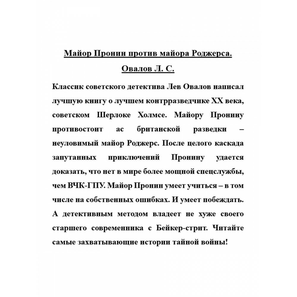Классик советского детектива Лев Овалов написал лучшую книгу о лучшем контрразведчике ХХ века, советском Шерлоке Холмсе. Майору Пронину противостоит ас британской разведки – неуловимый майор Роджерс. После целого каскада запутанных приключений Пронину удается доказать, что нет в мире более мощной спецслужбы, чем ВЧК-ГПУ. Майор Пронин умеет учиться – в том числе на собственных ошибках. И умеет побеждать. А детективным методом владеет не хуже своего старшего современника с Бейкер-стрит. Читайте самые захватывающие истории тайной войны!