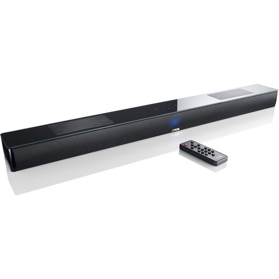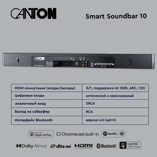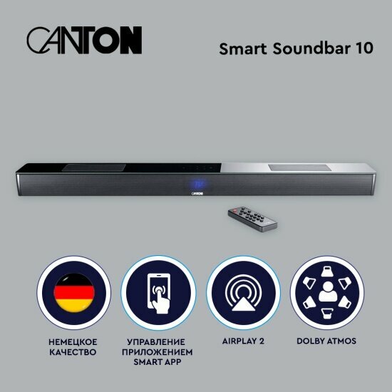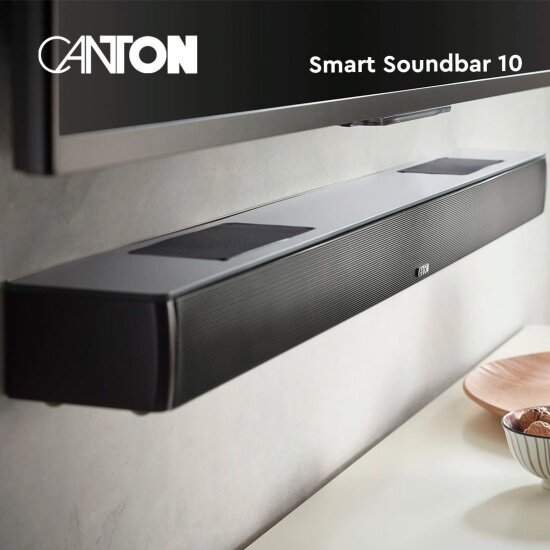 Canton Smart Soundbar 10 представляет собой виртуальную систему пространственного звучания. Конструкция выполнена с применением фазоинверторного акустического оформления, что делает звучание более объемным и глубоким. Общая мощность акустической системы составляет 300 Вт. За воспроизведение басов отвечает широкополосный 3-х дюймовый НЧ-драйвер, а средние частоты воспроизводятся с помощью 2-х дюймового СЧ-динамика, выполненного с применением современной технологии Dolby Atmos. Оба динамика оснащены диффузорами из алюминия.