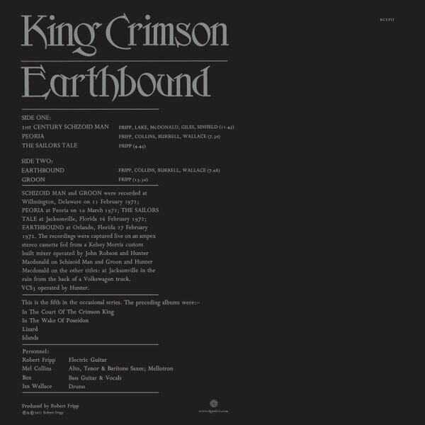 Earthbound - первый концертный альбом King Crimson, вышедший в 1972 году. Это бюджетная запись в оригинальном составе. И это первый официальный концертный релиз группы с их фирменной песней 21st Century Schizoid Man и расширенной концертной версией их B-сайда 1970 года Groon, раннее не выходивший на виниле, а также два импровизированных трека со скат-вокалом Боза Баррелла. Юбилейное к 50-летию выхода переиздание 2022 года. Издание на 200-гр виниле. Первое издание на виниле после выхода альбома. Мастеринг 2022 года одобрен лично Робертом Фриппом. King Crimson - британская рок-группа, основанная в 1968 году барабанщиком Майклом Джайлзом и гитаристом Робертом Фриппом. С первых альбомов King Crimson завоевали славу лидеров прогрессив рока и экспериментальной музыки. Состав King Crimson постоянно менялся, несколько раз происходил развал группы и её воссоединение, и только Роберт Фрипп всегда оставался постоянным участником.