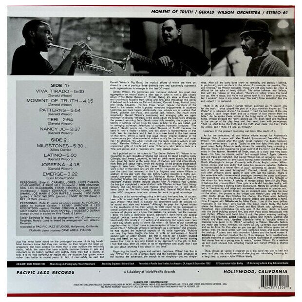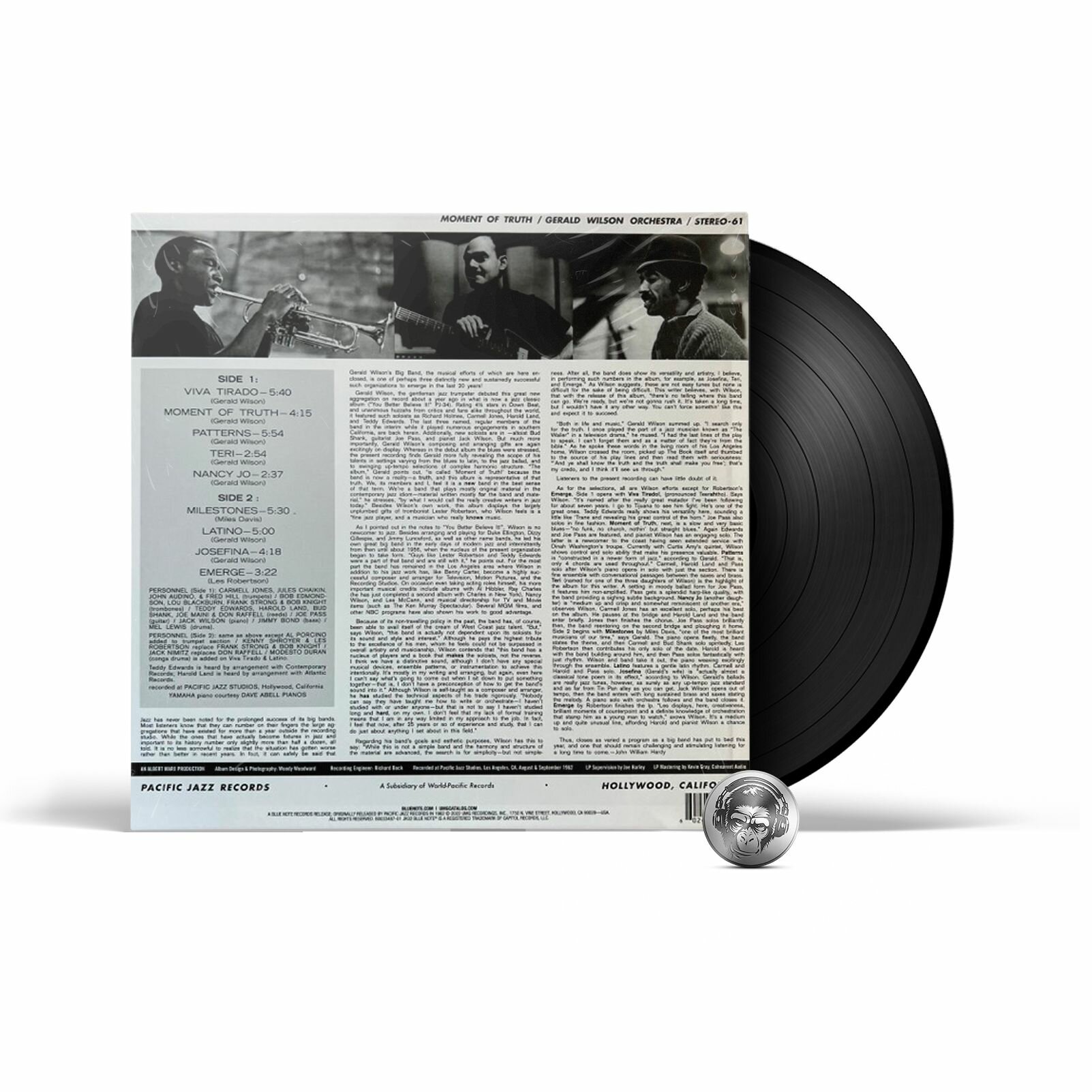 Moment Of Truth - переиздание студийного альбома музыканта Джеральда Уилсона и его коллектива, перовначально выпущенного в 1962 году. Релиз представлен на черном 180-граммовом аудиофильском виниле в серии Blue Note Tone Poet Series. Джеральд Уилсон - американский джазовый музыкант, композитор и преподаватель. Работал с музыкантами: Дюк Эллингтон, Сара Воан, Рэй Чарльз, Джули Лондон, Диззи Гиллеспи, Элла Фицджеральд, Бенни Картер, Лайонел Хэмптон, Билли Холидей, Дайна Вашингтон, и Нэнси Уилсон.