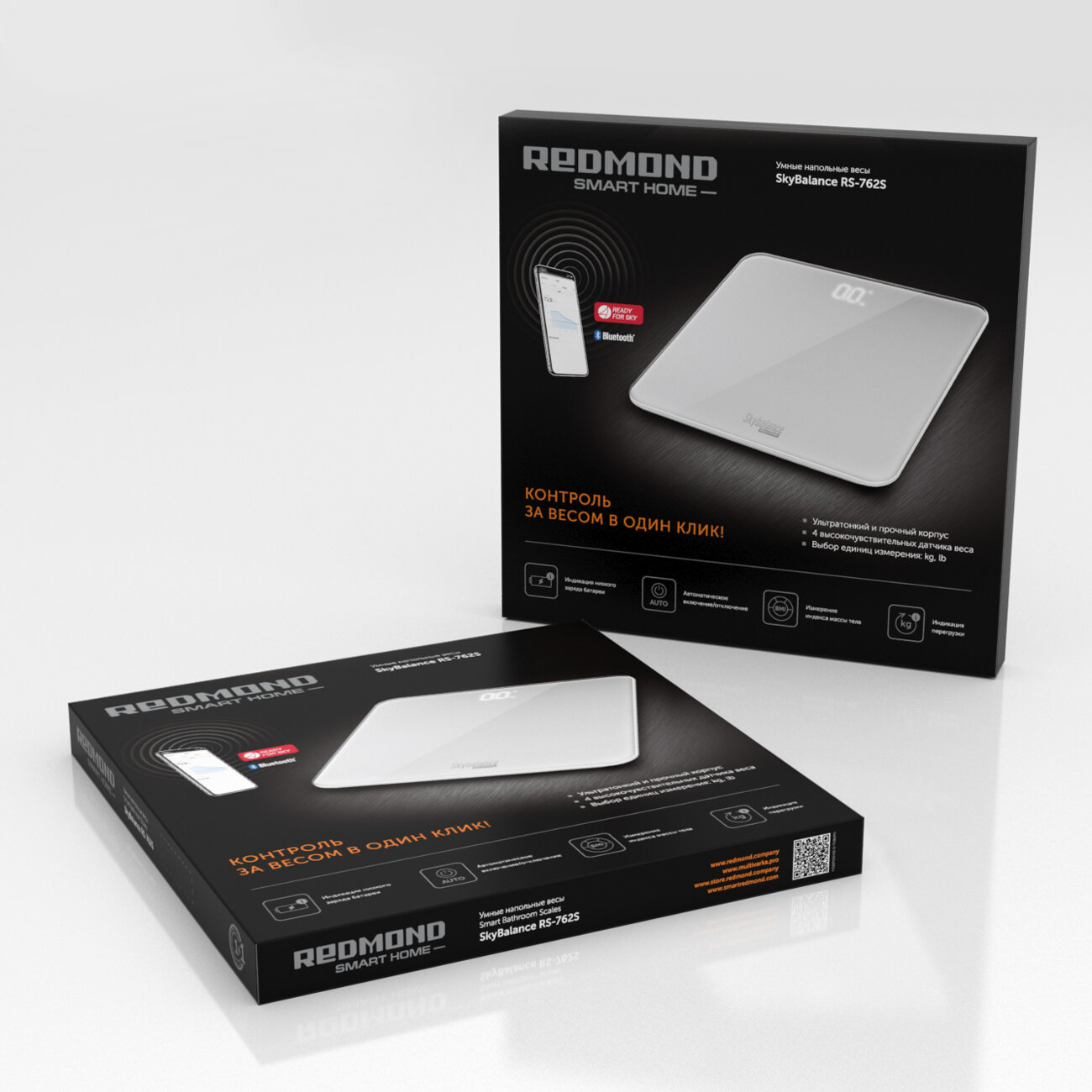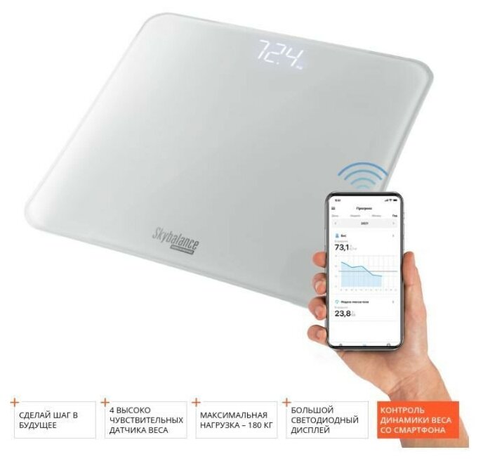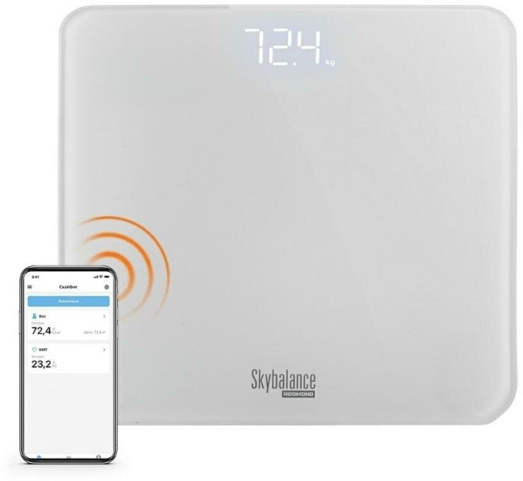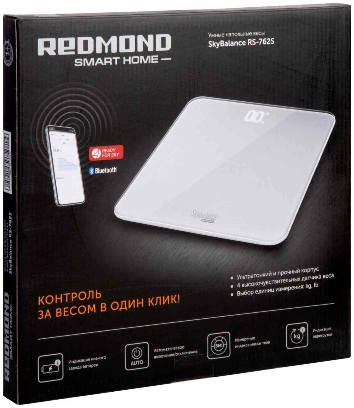 REDMOND SkyBalance RS-762S - умные напольные весы с технологией дистанционного управления. Прибор не только измеряет массу тела с высокой точностью, но и сохраняет данные в мобильном приложении. Со SkyBalance следить за здоровьем и фигурой легко и удобно! SkyBalance передает данные каждого взвешивания в мобильное приложение Ready for Sky. Программа сохраняет их и строит наглядный график изменений, а также рассчитывает индекс массы тела. Платформа весов выполнена из прочного закаленного стекла. Благодаря ультратонкому корпусу всего в 7 мм их удобно хранить под кровать или мебелью. Также прибор оснащен ярким светодиодным дисплеем, на котором хорошо видны результаты взвешивания.