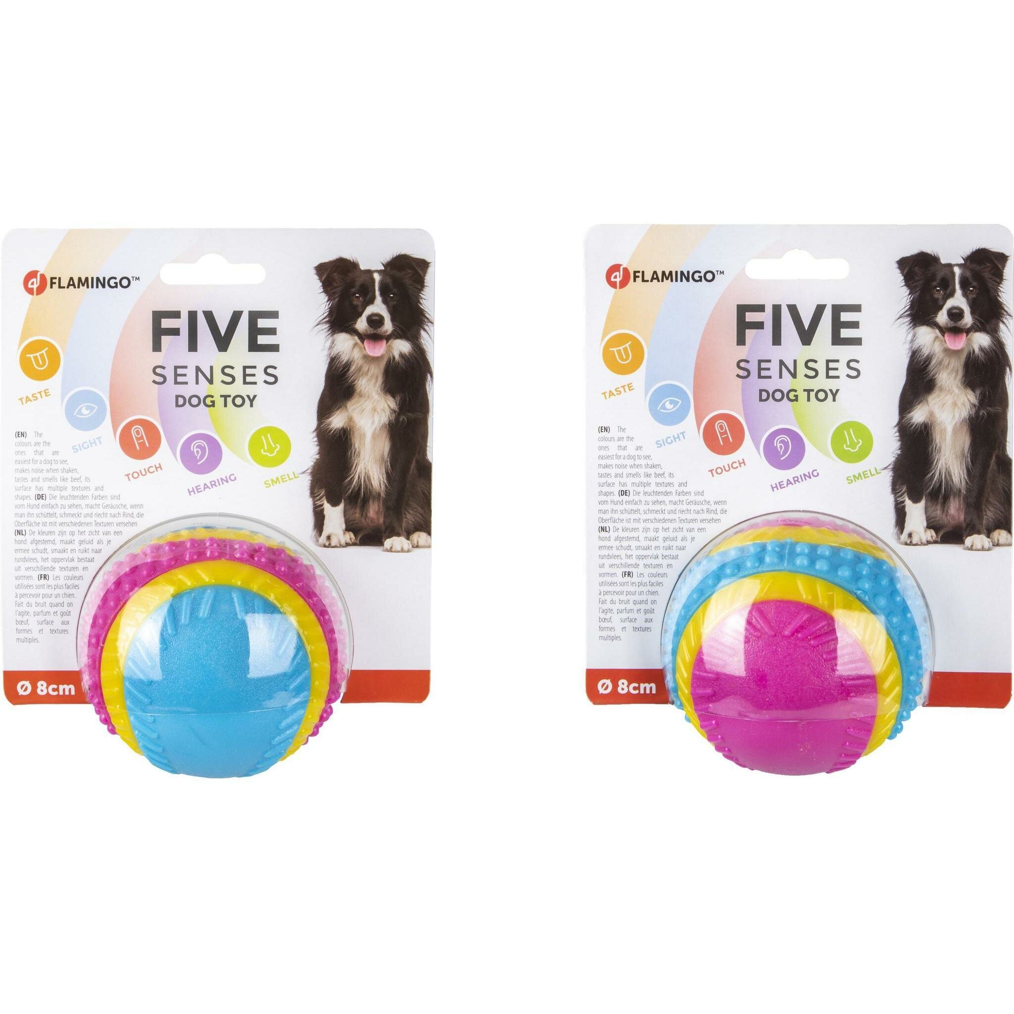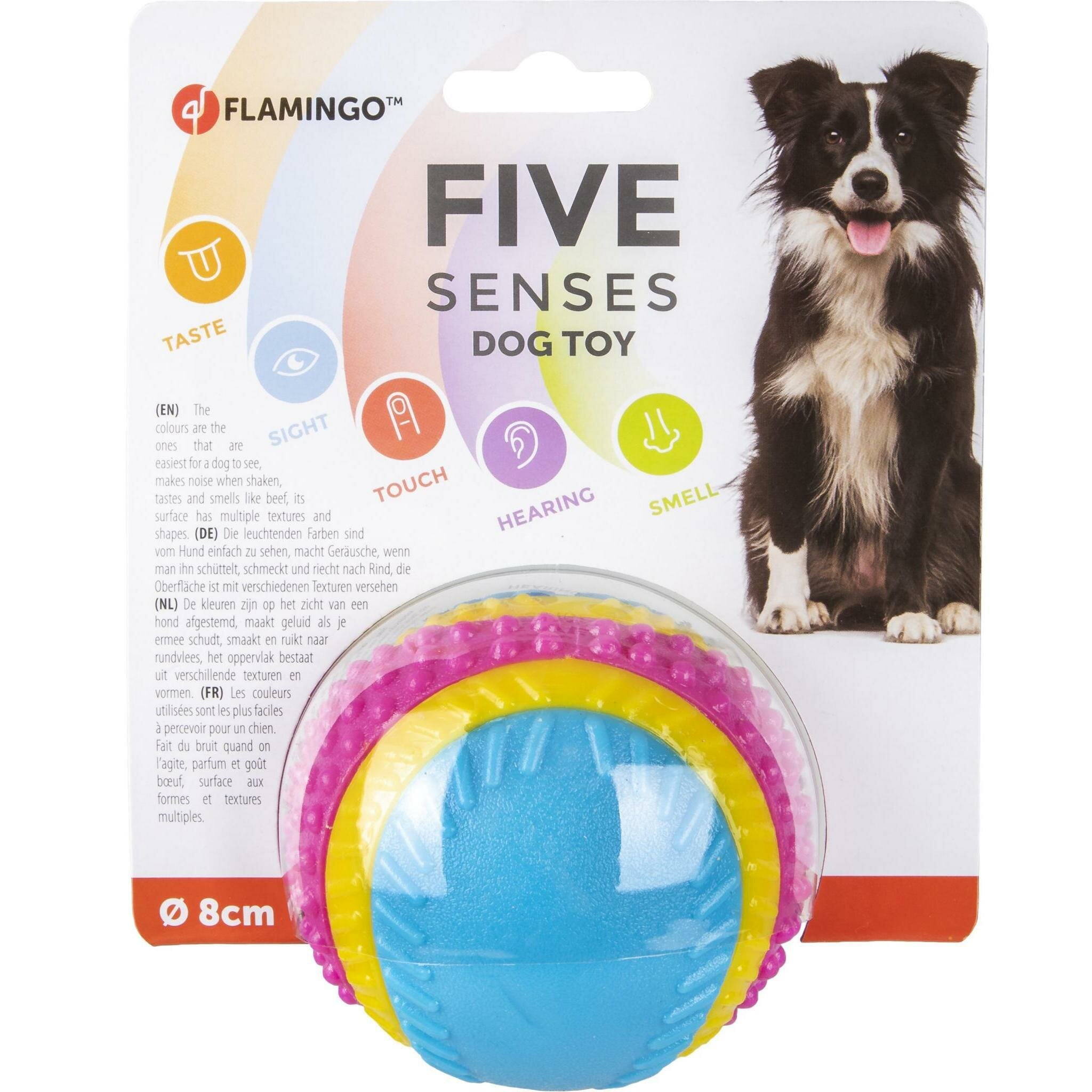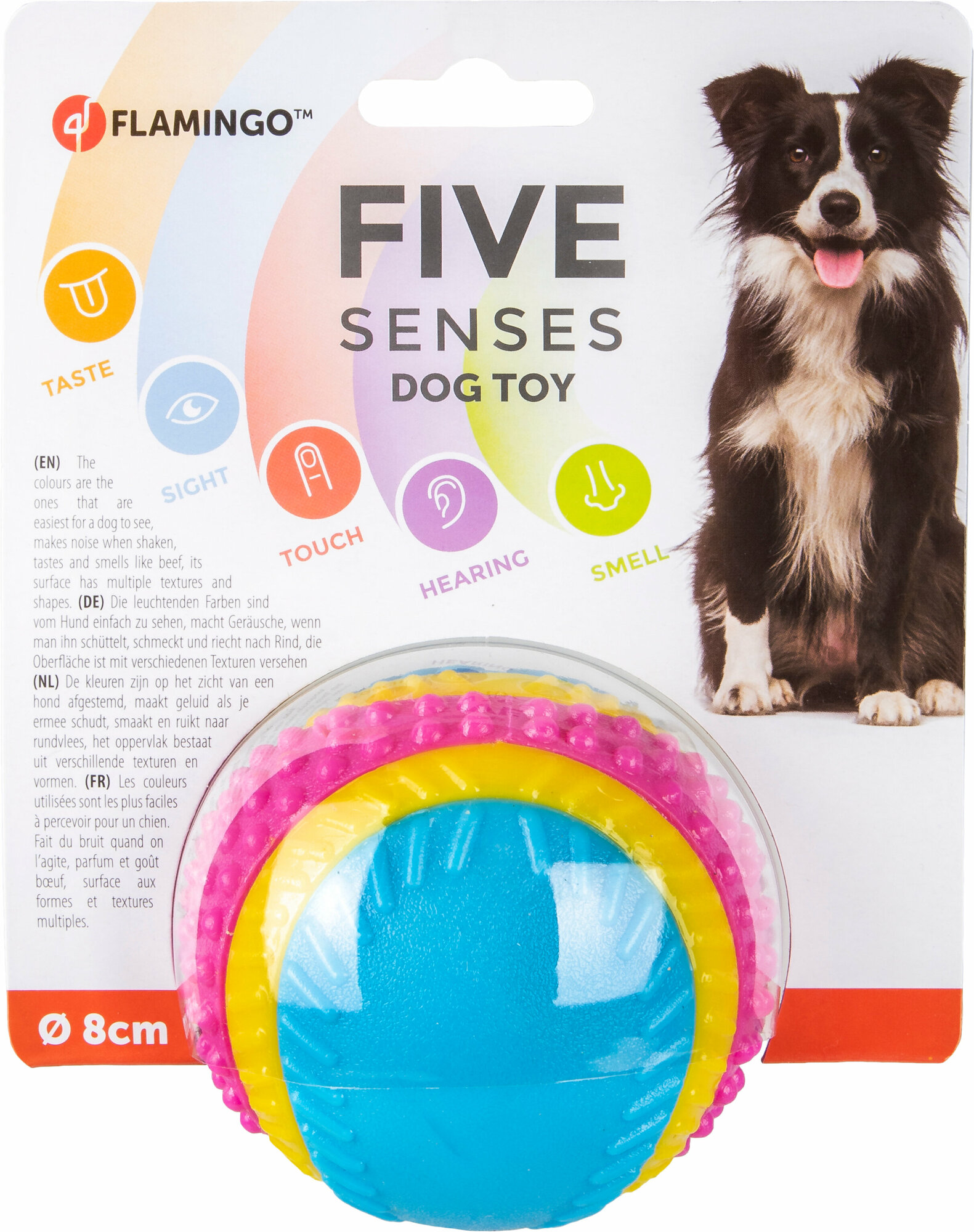 Уникальная инновационная интерактивная игрушка Flamingo 5 SENSES BALL - это совершенно новый вид мяча с максимальной мультисенсорной привлекательностью, который активирует 5 чувств Вашей собаки.* Зрение - подобраны яркие цвета, которые легче всего различить животному* Звук - при встряхивании издает звук, а также скрипит при сжатии* Запах - пахнет говядины* Вкус - со вкусом говядины* Осязание - мультитекстурированная поверхность для дополнительного интереса и стимуляции активности.Ваша собака будет в восторге!