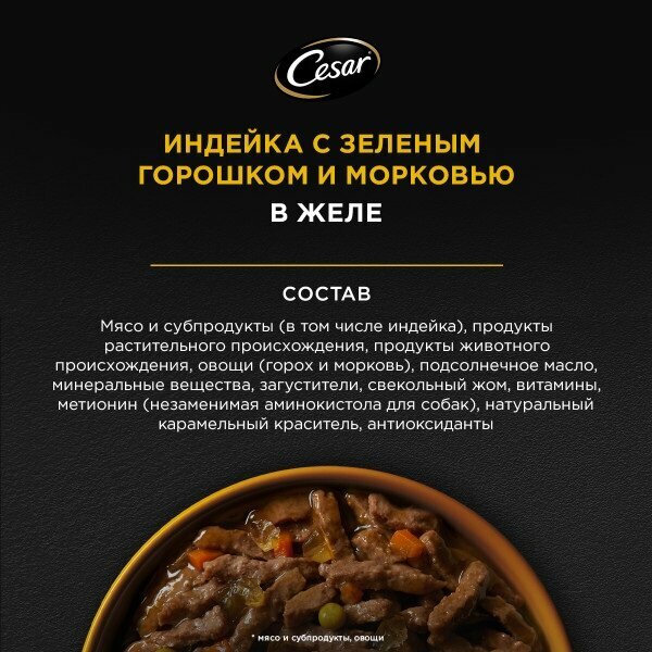 Cesar Natural Goodness влажный корм для собак, с индейкой, горохом и морковью в желе (28шт в уп) 80 гр. Влажный корм Cesar Natural Goodness для собак – это новые натуральные рецепты для вашего любимца. Аппетитные кусочки с овощами порадуют лучшего друга и раскроют вкус ингредиентов в сочетании с густым соусом и нежным желе. В составе новой линейки Cesar Natural Goodness содержатся только натуральные ингредиенты высокого качества, цельные овощи, а также витамины и антиоксиданты. В каждом кусочке содержится более 80% мяса и в составе нет сои, консервантов, искусственных красителей и усилителей вкуса. Все рационы являются 100% полнорационными и сбалансированными - а значит подходят для ежедневного питания. Побалуйте своего любимца вкусными и разнообразными рационами от Cesar. Состав: мясо и субпродукты (в том числе индейка), продукты растительного происхождения, продукты животного происхождения, овощи (горох и морковь), подсолнечное масло, минеральные вещества, загустители, свекловичный жом, витамины, метионин, натуральный карамельный краситель, антиоксиданты.Содержание питательных веществ (100 г): белок – 7,0 г; жир – 3,5 г; зола – 1,5 г; клетчатка – 0,2 г; влага – 85 г; витамин А – не менее 130 МЕ; витамин Е – не менее 1,1 мг. Энергетическая ценность (100 г): 72 ккал / 302 кДж.Рекомендуемое количество корма CESAR (вес животного, кг – упаковок корма в сутки, шт): 3 кг – 4; 4 кг – 5; 6 кг – 6-7. Вашего питомца следует кормить кормом комнатной температуры. Не забывайте о свежей воде, которая должна быть в миске вашего питомца постоянно.Хранить при температуре от +4 С до +35 С и относительной влажности воздуха не более 75 %.