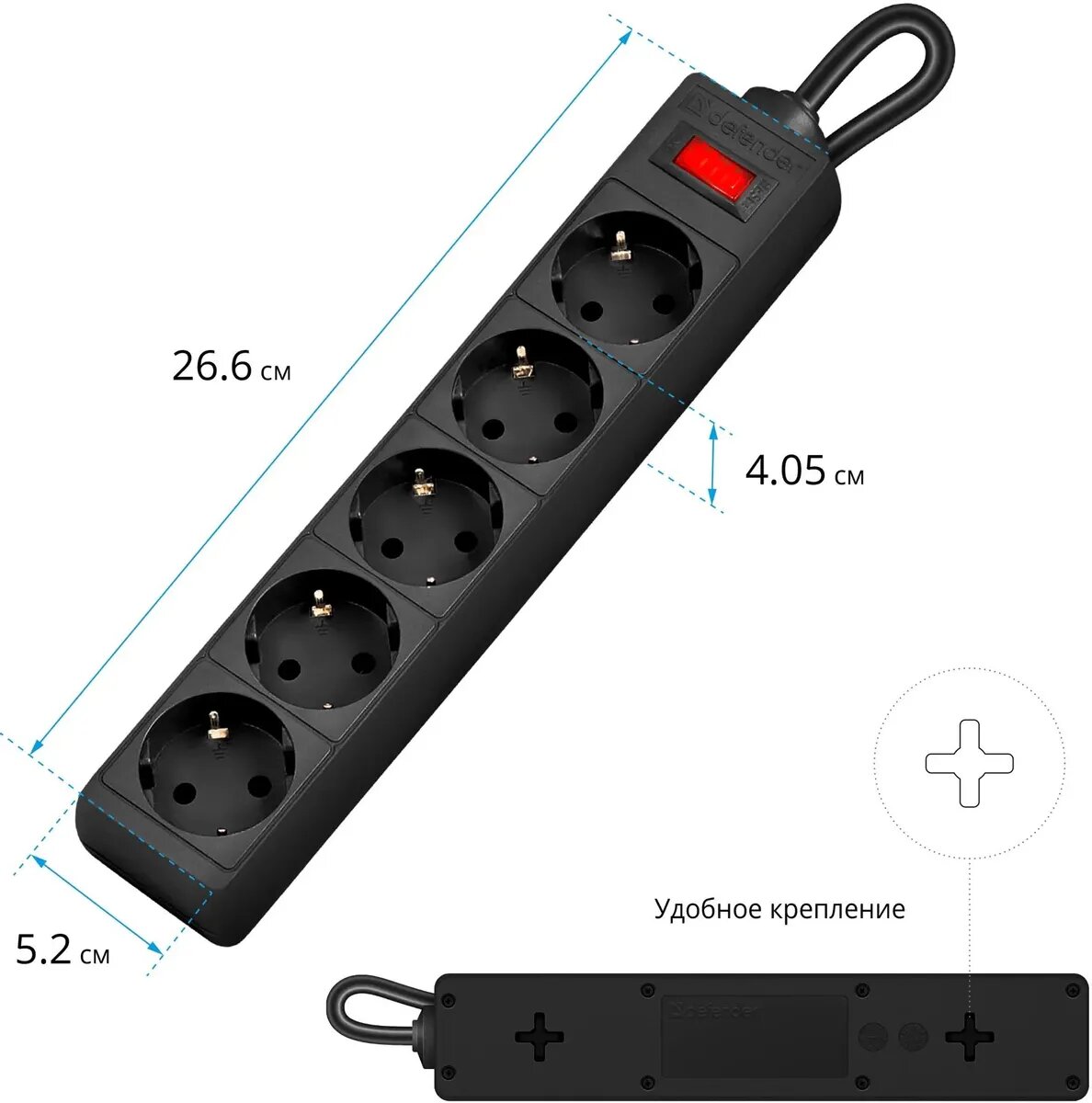 Посредством сетевого фильтра к одной розетке подключается несколько устройств, кроме того, фильтр Defender ES 1.8 m Black 5 розеток – защита от сетевых перегрузок и сбоев напряжения. Рабочие характеристики – стандартное напряжение сети 220В при частоте 50-60 Гц, энергии устройство поглощает максимум 125 Дж, корпус выполнен из пластика чёрного цвета.