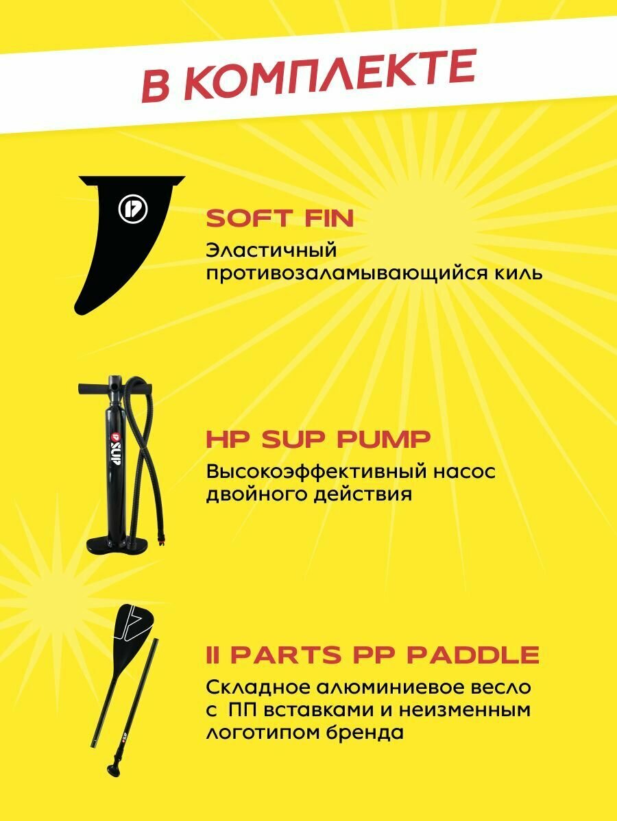| Комплектация | Сапборд Prime Sup Classic yellow 10'5" x 34" x 6"; весло алюминиевое; страховочный лиш; плавник; двухходовой насос; ремкомплект; плавник. |