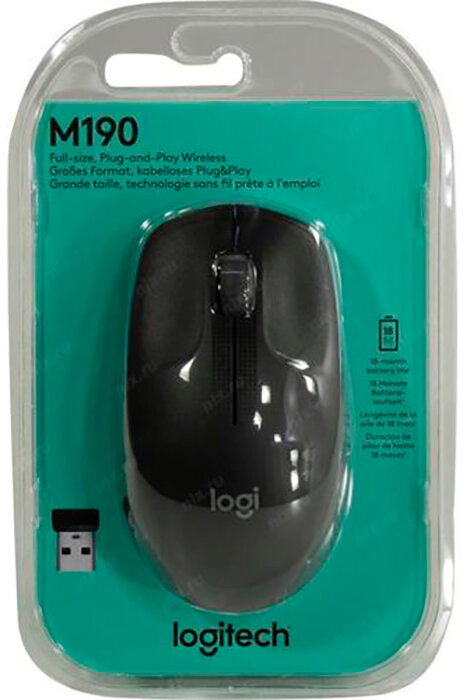 Мышь Logitech M190 черный/серый, оптическая, разрешение сенсора 1000dpi, беспроводная, кнопок: 2, подходит для правой и левой руки (910-005906)