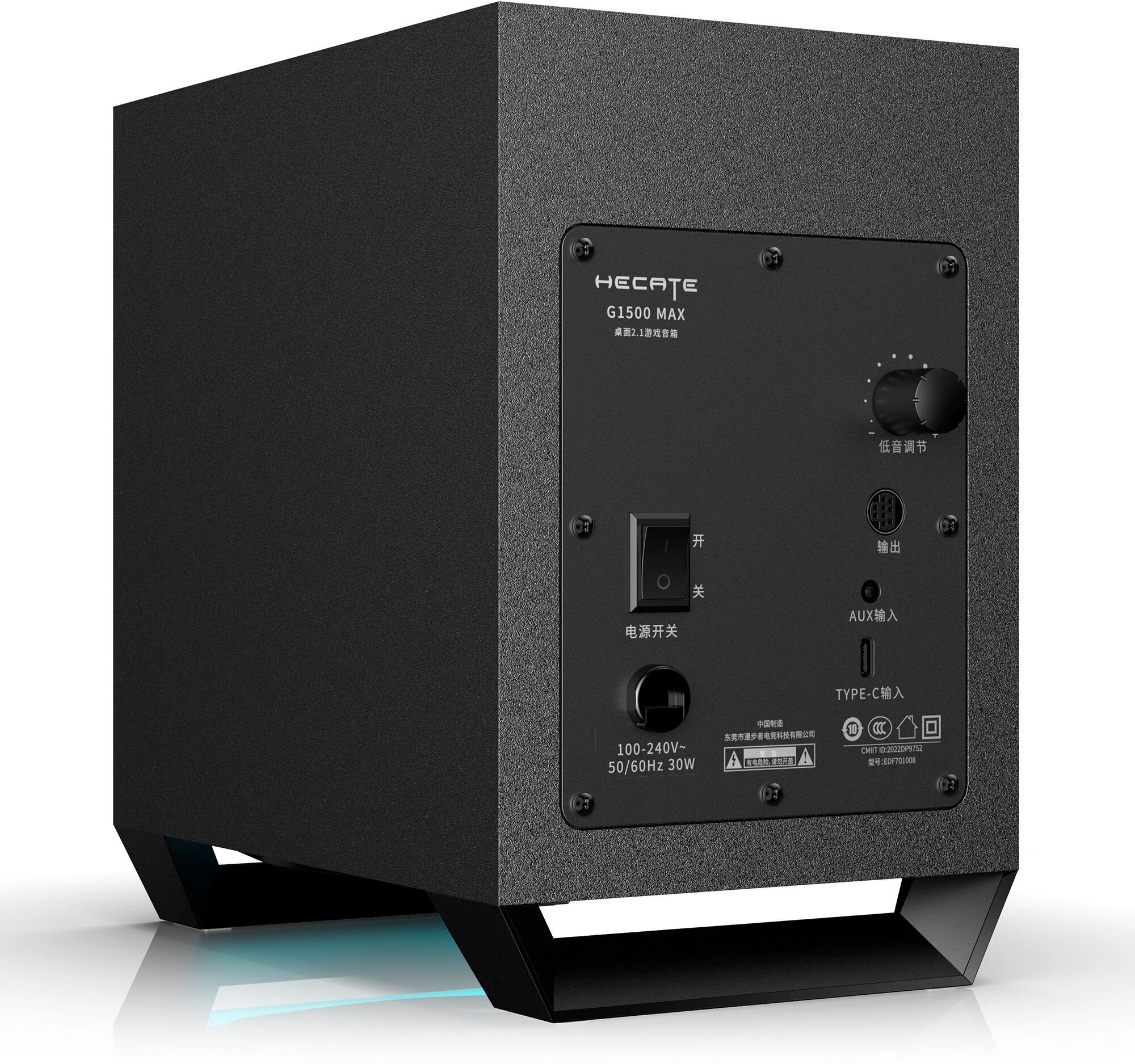 Колонки 2.1 Edifier G1500 MAX мощностью 30 Вт можно использовать с телевизором, ноутбуком, игровой консолью и другими устройствами. Они подключаются через Bluetooth, обеспечивая надежное соединение в радиусе 10 м. Колонки получают питание от сети 220 В. Возможна настройка акустической системы в зависимости от целей. Доступны такие режимы звучания: фильмы, игры и музыка. Игровой режим содержит звуковые эффекты, в музыкальном ? звук более сбалансированный с четким звучанием музыкальных инструментов. В кино-режиме отчетливо слышен бас. Комплект Edifier G1500 MAX включает в себя две фронтальные колонки и активный сабвуфер мощностью 15 Вт. Они выполнены из прочного пластика, а на колонках закреплены металлические решетки для защиты динамиков. Вставки с подсветкой RGB украшают сабвуфер и колонки ярким свечением синего, зеленого, красного, голубого и розового цвета. Доступны режимы медленного мигания и постоянного свечения.