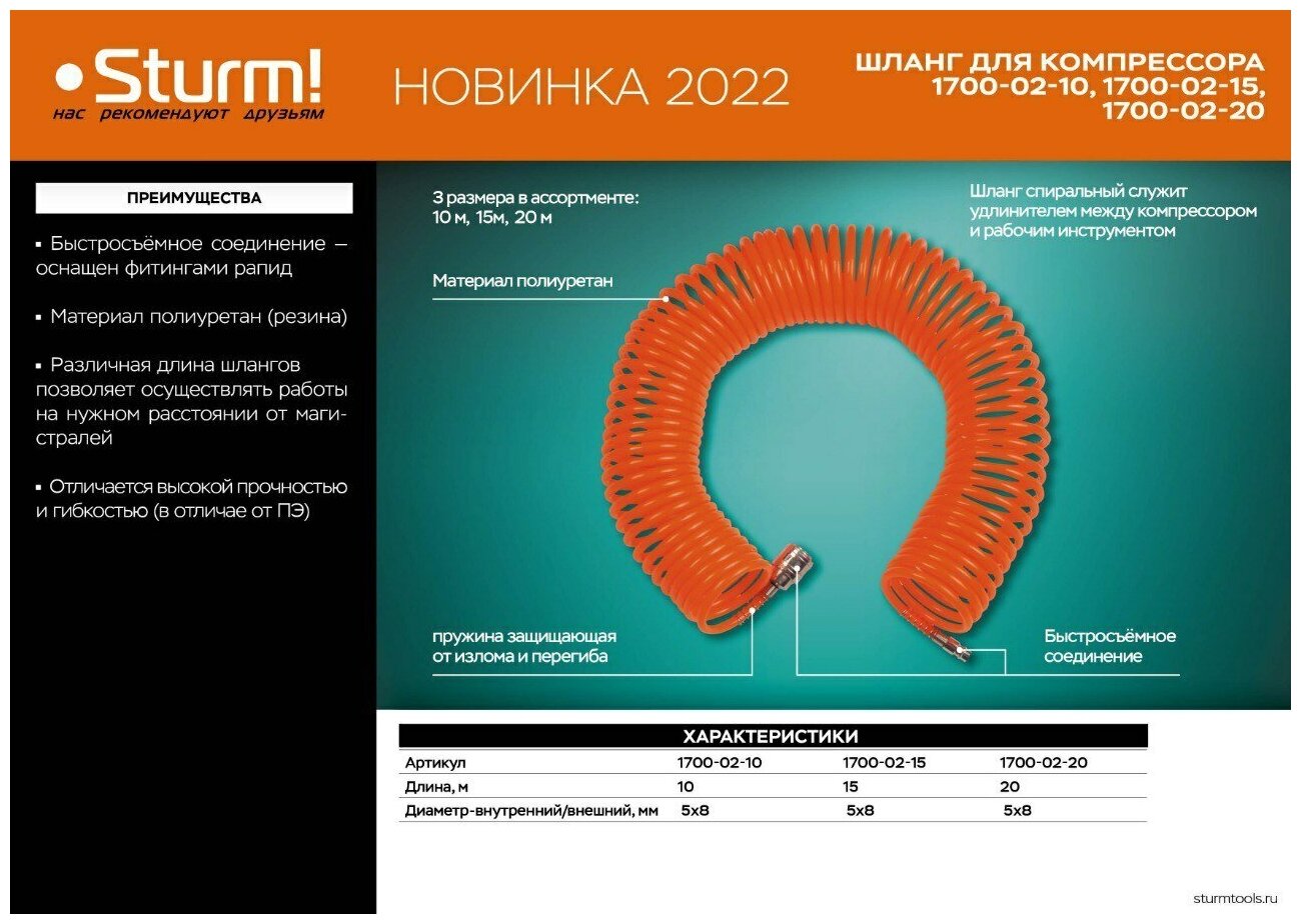 Шланг Sturm! спиральный служит удлинителем между компрессором и рабочим инструментом. Различная длина шлангов позволяет осуществлять работы на нужном расстоянии от магистралей.Отличается высокой прочностью и гибкостью (в отличае от ПЭ). Быстросъёмное соединение- оснащен фитингами рапид.
