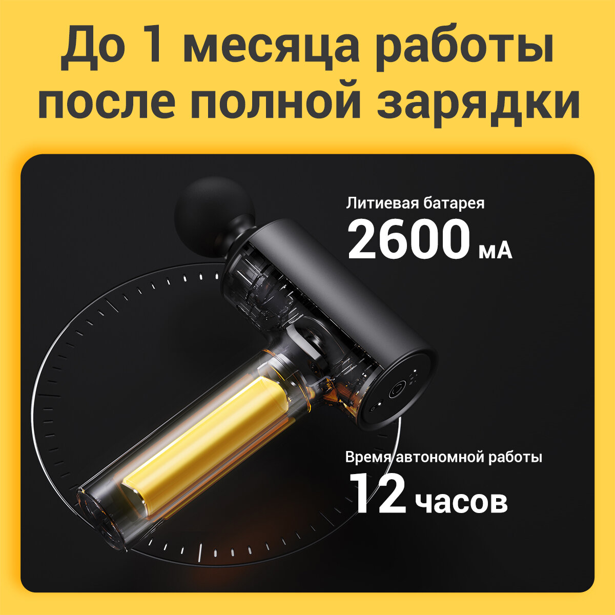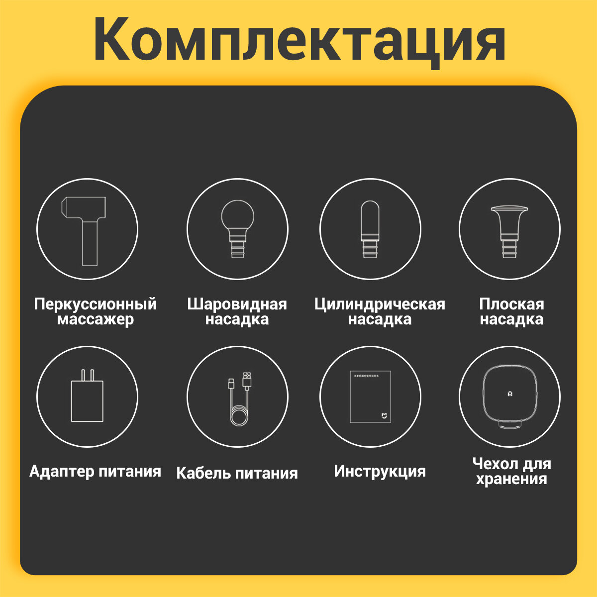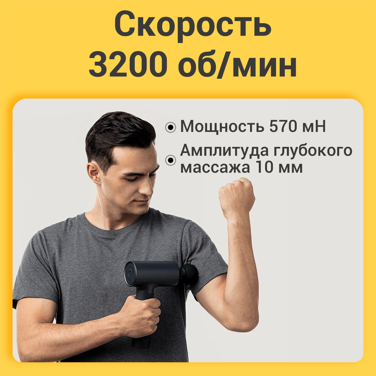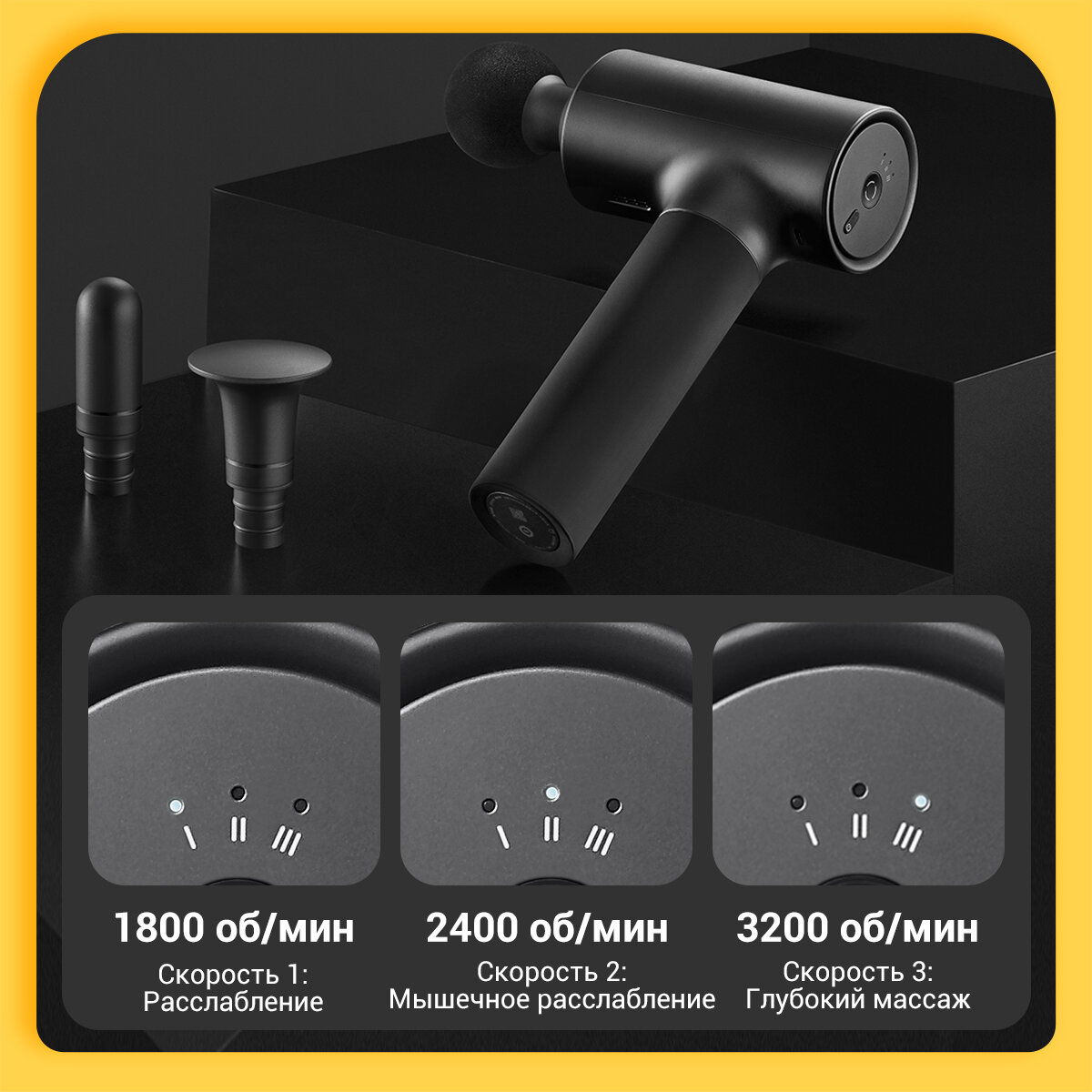 | Прочие особенности и свойства | Массажный пистолет Xiaomi может обеспечить постоянную стабильную выходную мощность при внешнем давлении. ,Имеет три режима скорости. ,Зарядный порт типа C совместим с зарядными кабелями для ноутбуков и мобильных телефонов.,Массажный пистолет Xiaomi оснащен скрытым входом и выходом воздуха.,Защита от короткого замыкания.,Защита от блокировки ротора.,Защита от перегрева.,Интенсивность 1 уровня:Освежающий массаж 1800 об/мин.,Интенсивность 2-го уровня:расслабление мышц 2400 об/мин.,Интенсивность 3 уровня |