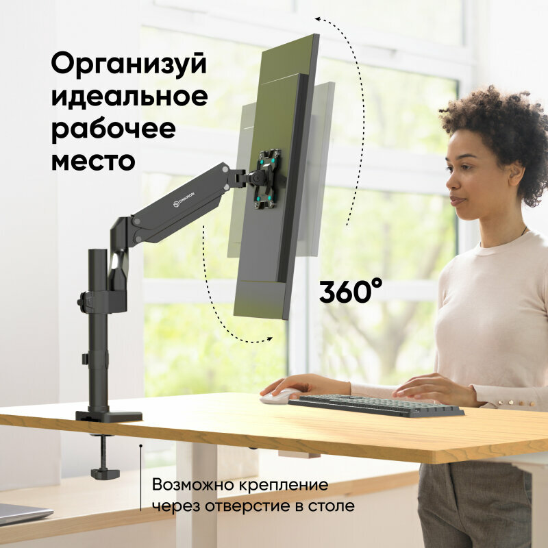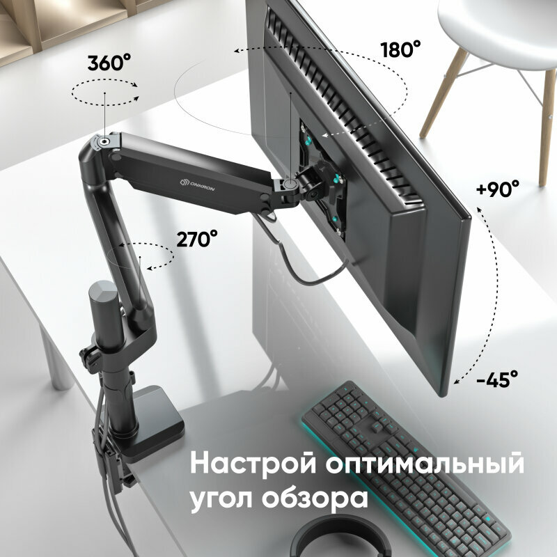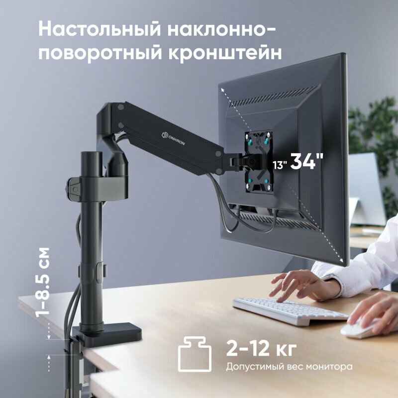 | Дополнительно | Настольный наклонно-поворотный кронштейн с регулировкой высоты для мониторов с диагональю до 34 дюймов., , Кронштейн Onkron G75 не оставит никого равнодушным, не только потому, что подходит для всех мониторов и телевизоров, диагональю от 13" до 34" и весом от 2 кг до 12 кг, радиусом изгиба монитора от 4000R до 1800R, что позволяет легко и просто передвигать монитор в любых плоскостях, и даже менять его положение по вертикали! Всё это благодаря газовой пружине, располагающейся внутри корпуса кронштейна, именно она может зафиксировать монитор в любом положении и менять его не прилагая существенных усилий. Поворачивайте монитор вокруг своей оси на 270°, наклоняйте вверх и вниз, придвигайте или удаляйте от себя, поднимите монитор повыше или опустите пониже – всё это может наш кронштейн Onkron G75. , , Кронштейн Onkron G75 предназначен для лёгкой установки на столешницу стола дома или в офисе. Один из основных плюсов его в том, что прикрепить к столешнице его можно любым из двух удобных для Вас способов:, , За край стола: зажав столешницу струбциной – это позволит переносить его в последствии в другое место, не повредив при этом покрытие стола., Свободная установка |