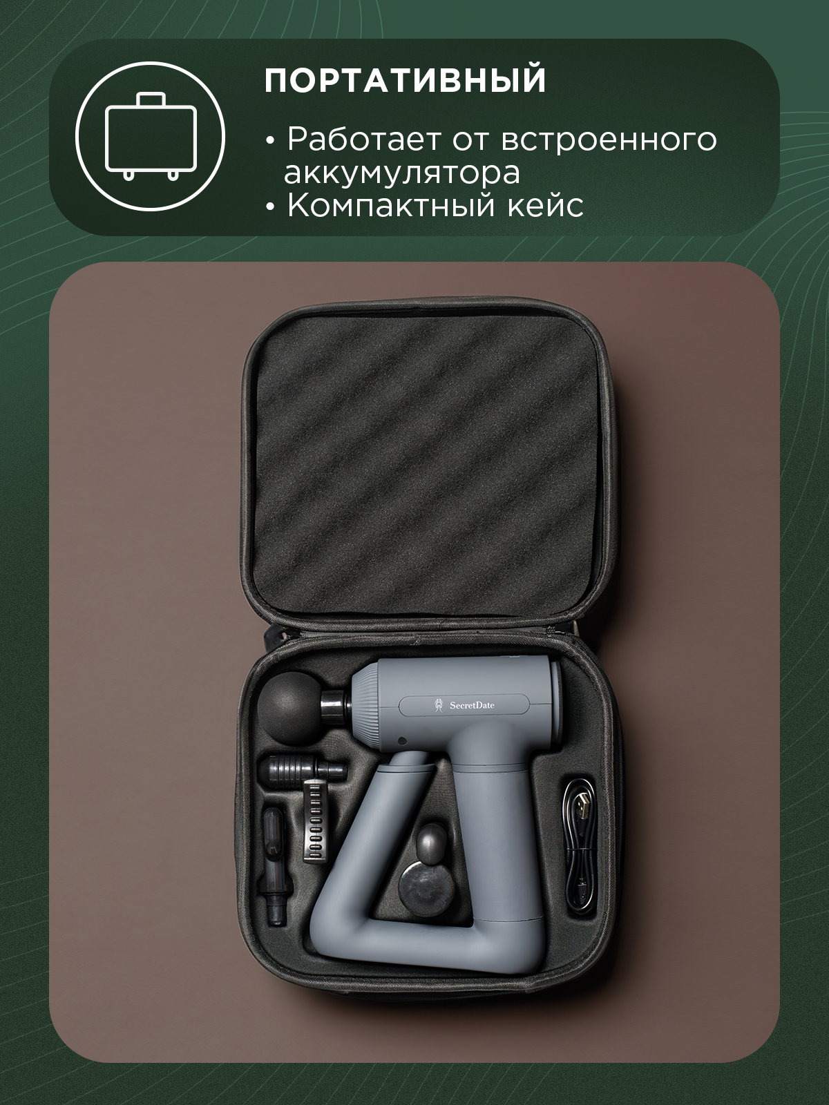 Перкуссионный массажер, насадка массажного пистолета ударяет по коже и подлежащим тканям с очень высокой частотой. Перкуссионный массажер разрабатывает мышцы и стимулирует внутренние органы. Помогает расслабиться, снять мышечную боль и усталость. Портативный, работает от встроенного аккумулятора.