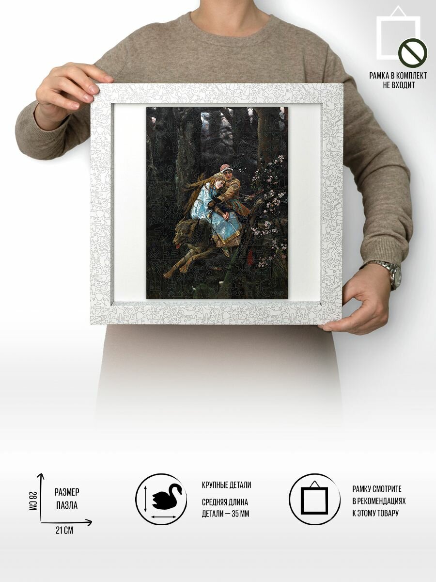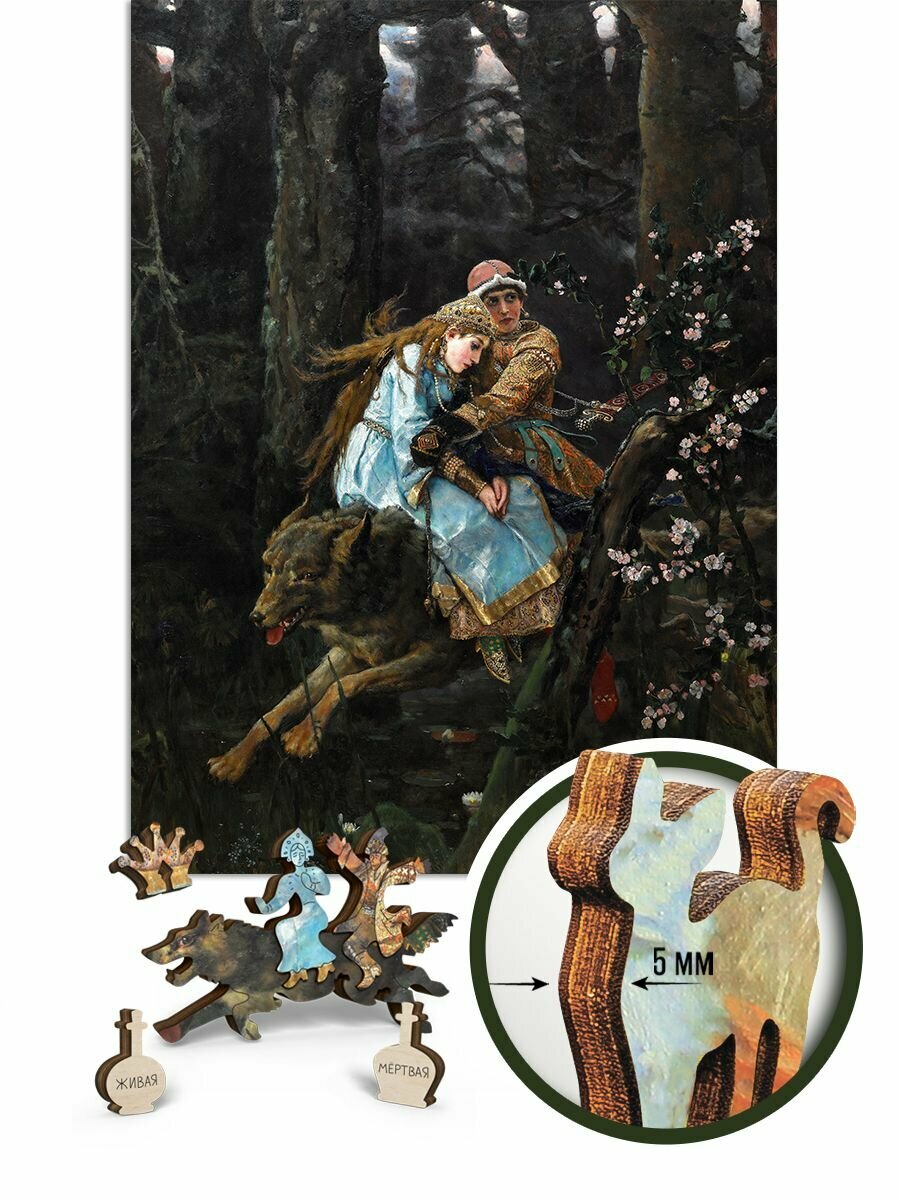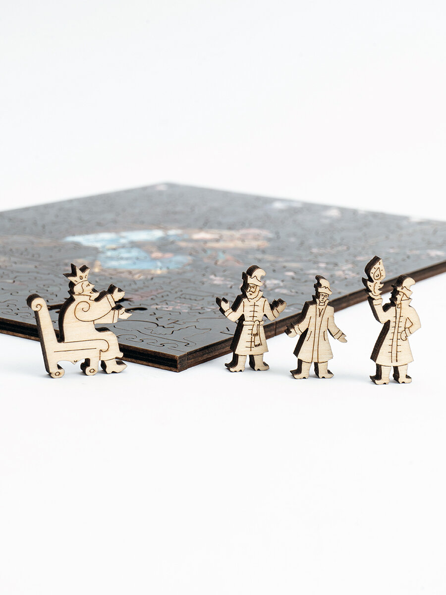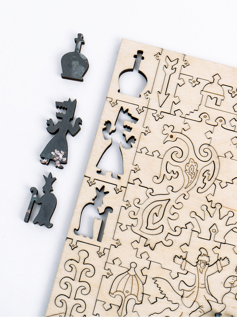 Знакомые каждому символы русских сказок открываются среди фигурных деталей пазла в лубочном стиле. Волшебная жар-птица, вороной конь, живая и мертвая вода, меч – кладенец, дерево с молодильными яблочками, сказочный царь, три богатыря, волки – оборотни и сам Иван Царевич с царицей на сером волке.