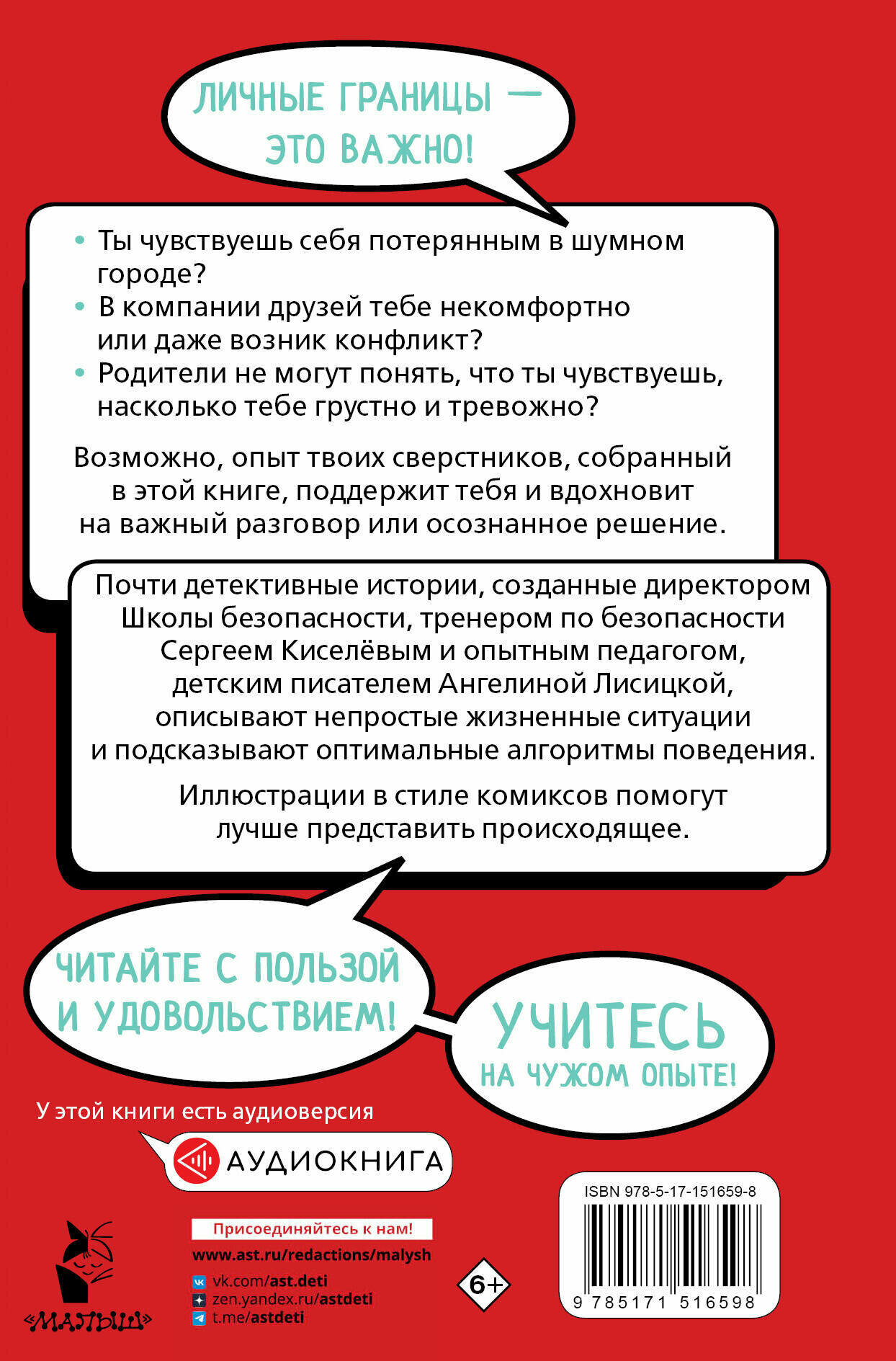 Подростки зачастую остаются беззащитными в современном городе. Внутренние противоречия, возведенные в квадрат в сложный период взросления, небольшой жизненный опыт — всё это ставит их под особую угрозу. Как достучаться до подросших детей, ведь они уже не хотят слушать родителей?! Чтобы защитить подростков, тренер по безопасности, директор Школы безопасности, кандидат юридических наук Сергей Киселёв вместе с детским писателем Ангелиной Лисицкой рассказали 15 остросюжетных, практически детективных историй, основанных на реальных событиях. В них совсем нет назидательности, но при этом они дают чёткие алгоритмы поведения в сложных жизненных ситуациях. Иллюстрации в стиле комиксов не оставят равнодушными самых придирчивых тинейджеров. Для младшего и среднего школьного возраста.