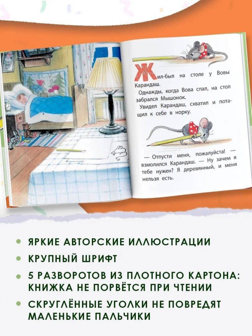 Эта книга предназначена именно для малышей: в ней яркие рисунки и крупные буквы, плотный картон не порвется при чтении, а скругленные уголки не повредят маленькие пальчики.