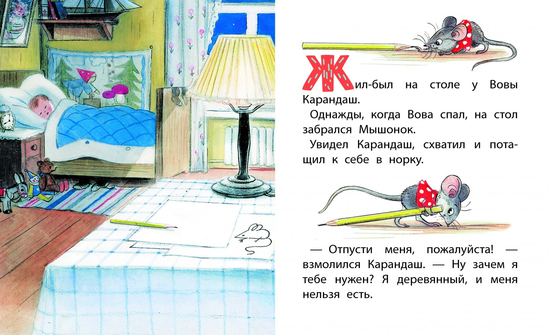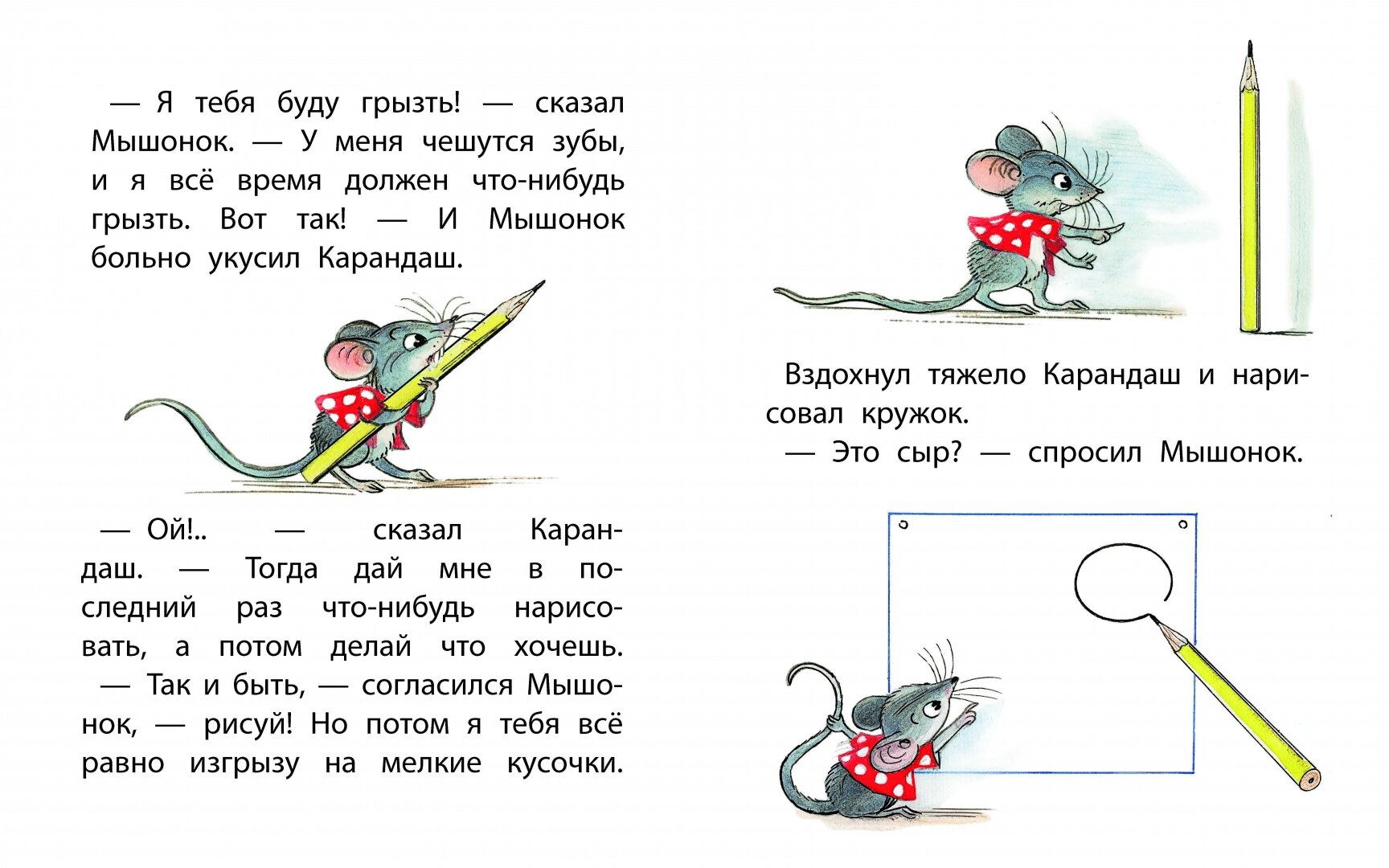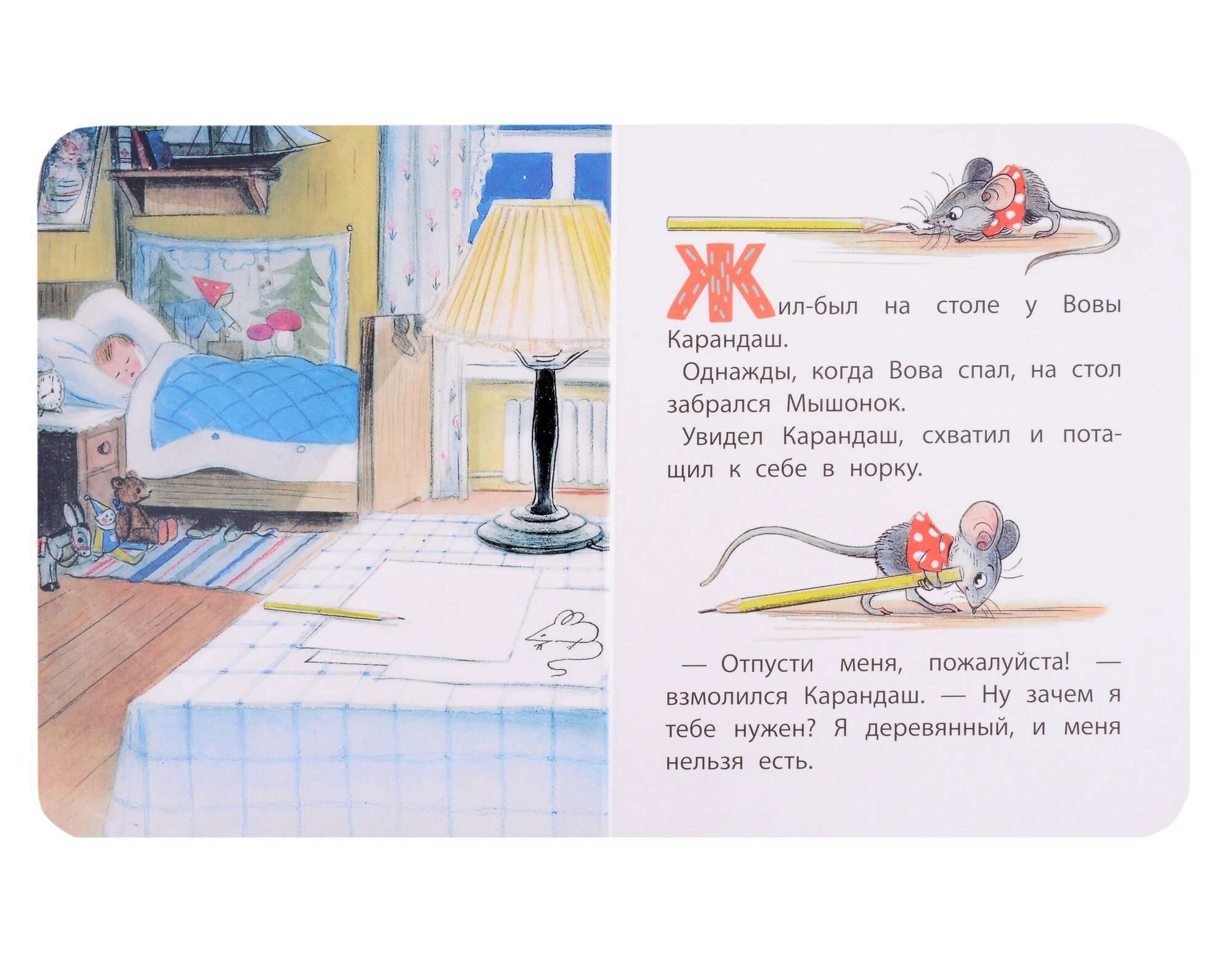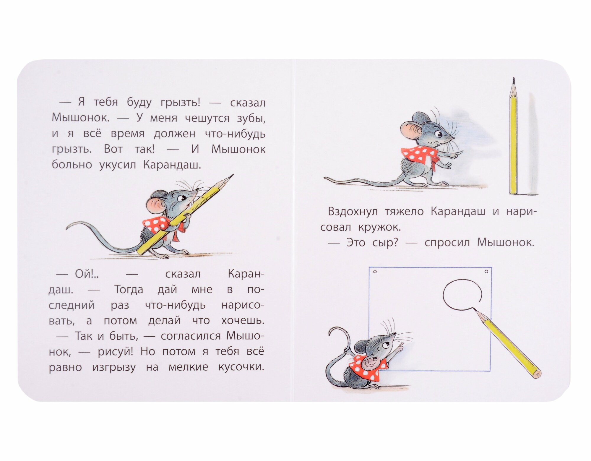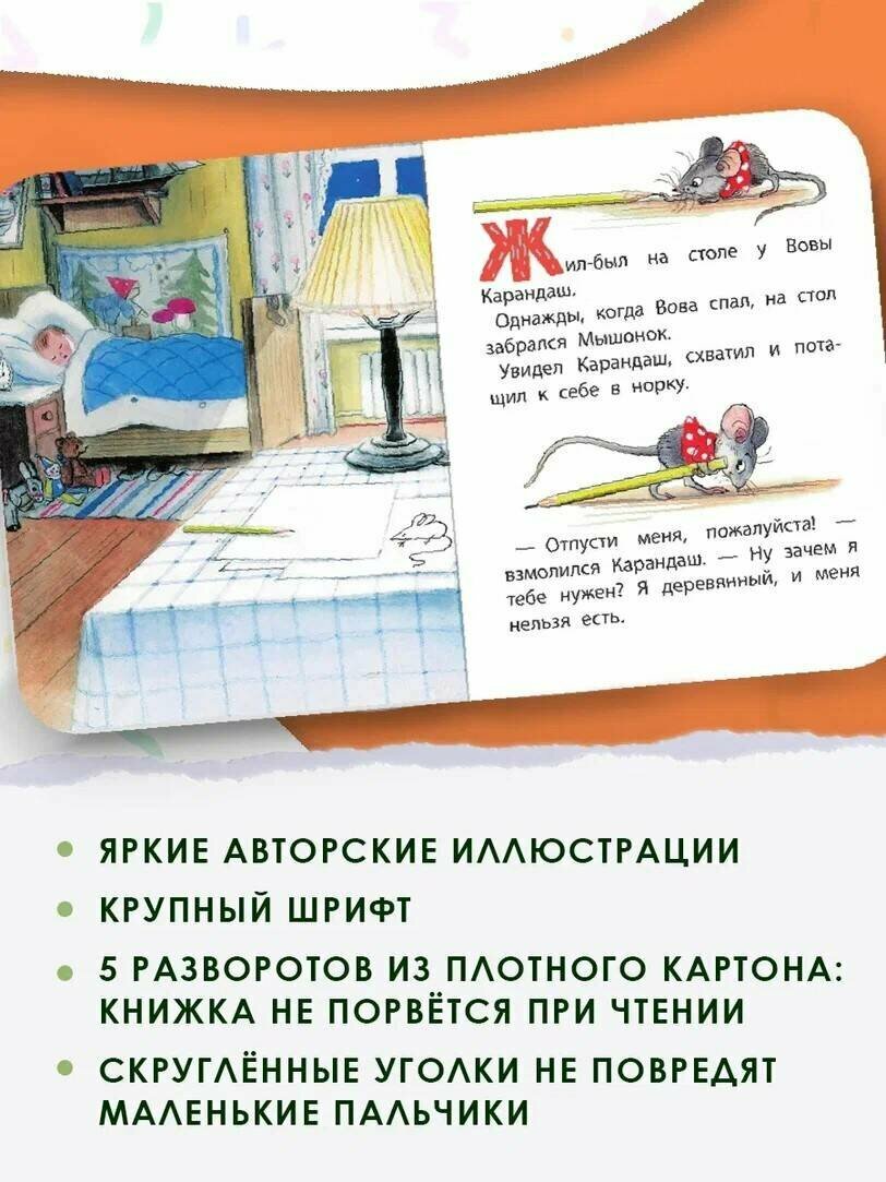 Жил-был на столе у Вовы Карандаш. Однажды нашёл его Мышонок и задумал сгрызть. Но Карандаш был умный и придумал, как Мышонка проучить – конечно же, с помощью рисунка! А что нарисовал Карандаш, вы узнаете из этой книжки и даже сможете повторить его рисунок!