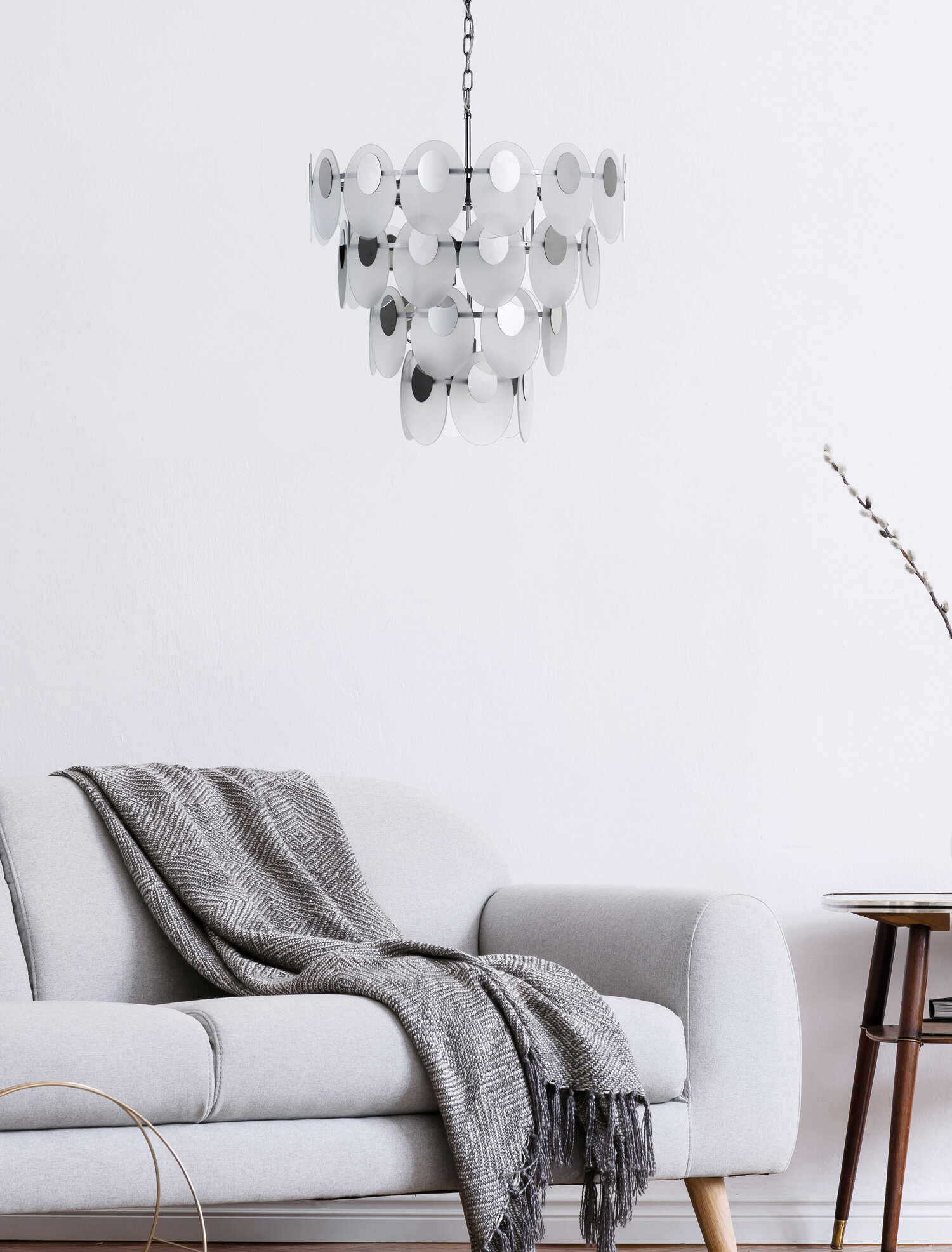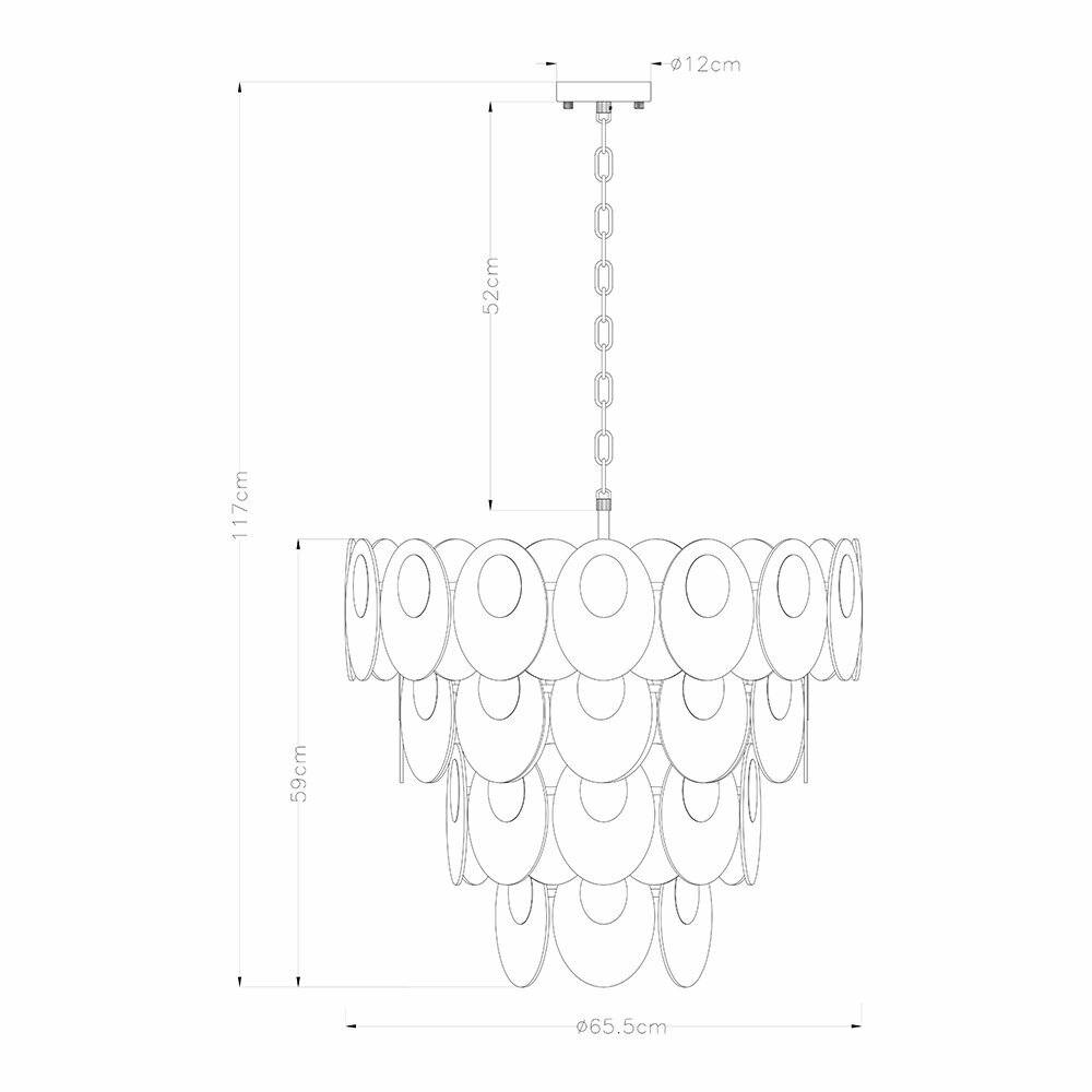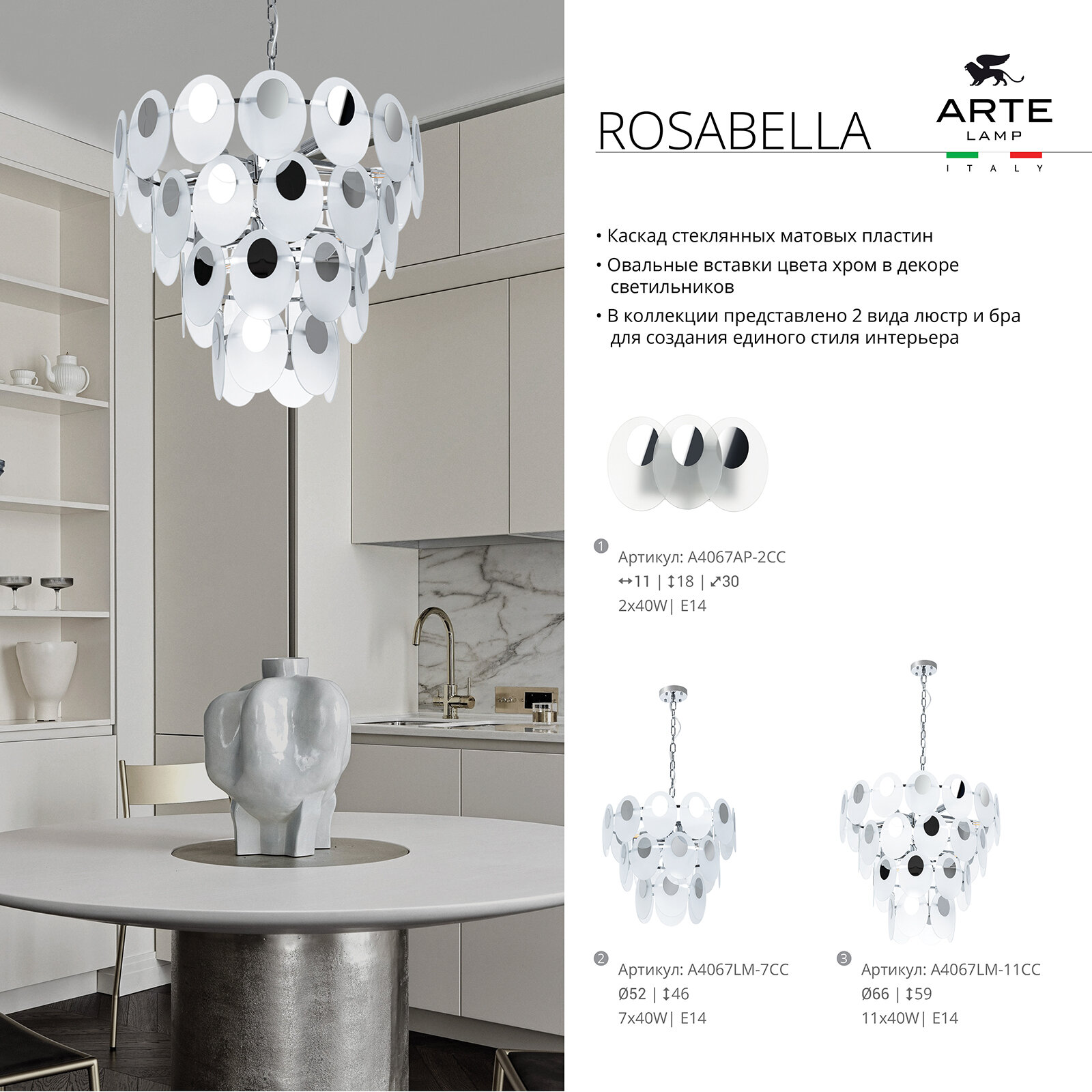 Подвесная люстра ARTE LAMP A4067LM-11CC серии ROSABELLA в стиле модерн. Подчеркнет стиль помещения. Высота 59 cm. Диаметр 66 cm Параметры пылевлагозащиты IP — 20. Форма конусная. Плафон стеклянный белого цвета, а материал/цвет арматуры металл/хром. Использует лампу с цоколем E14. Площадь освещения охватывает 14.5 m?. Идеально подходит для гостиной или спальни. Страна происхождения бренда — Италия.