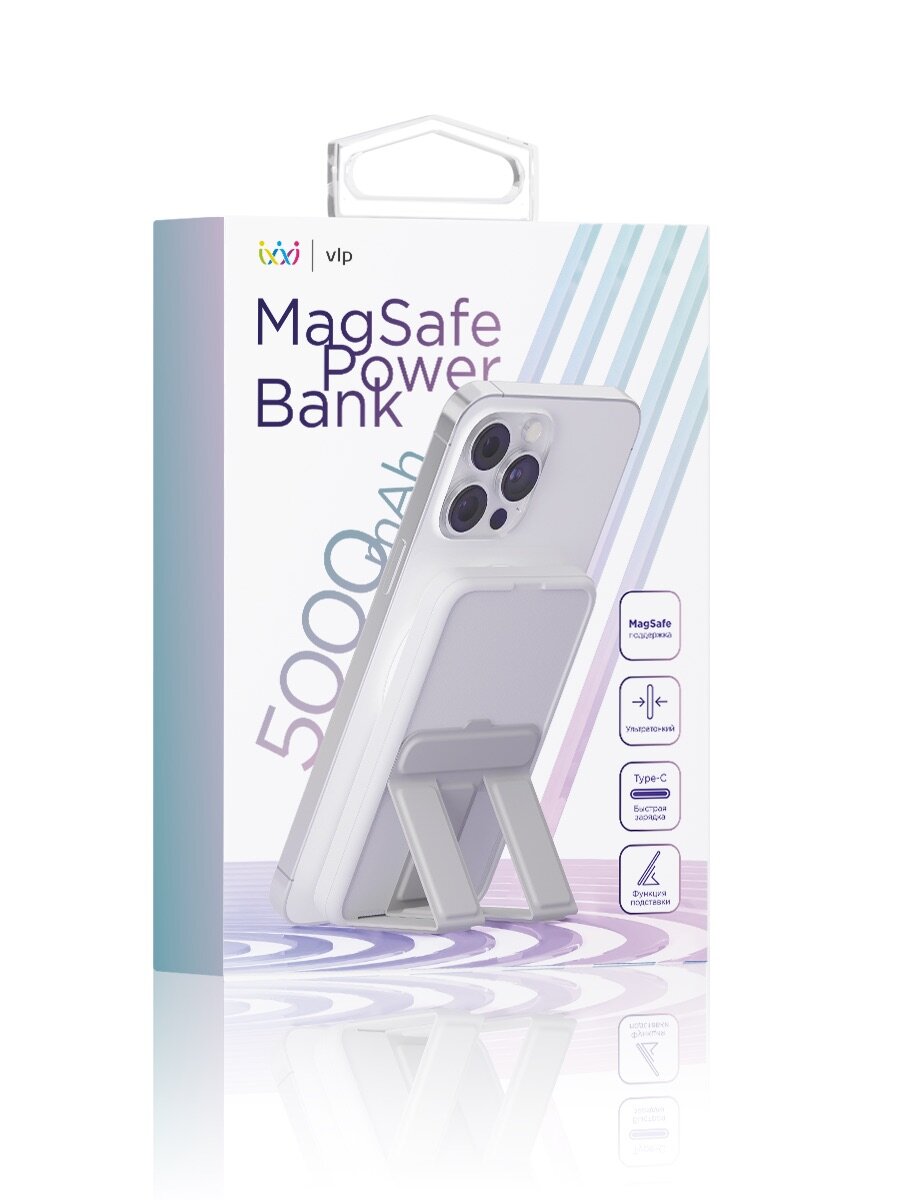 Компактный и ультратонкий аккумулятор емкостью 5000 мАч с функцией MagSafe обеспечивает безопасный заряд устройствам. Выполнен из качественного пластика. Оснащен складной подставкой из экокожи, внутренняя часть подставки с бархатистой подкладкой из микрофибры. Встроенные магниты позволяют легко и быстро трансформировать Powerbank в подставку для смартфона, чтобы пользоваться им и заряжать одновременно. Внешний аккумулятор поддерживает современный протокол быстрой зарядки Power Delivery 20Вт и беспроводную зарядку мощностью 15Вт. Наличие световой индикации позволяет определить уровень работы аккумулятора. Встроенная защита от перегрева, перезаряда элементов питания, превышения допустимого напряжения и силы тока подключенных устройств, короткого замыкания. Совместим со смартфонами и цифровыми устройствами с функцией зарядки от порта USB.