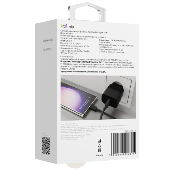 Сервис сравнения цен СкидкаГИД предлагает сравнить цены на товар «Сетевое зарядное устройство VLP GaN 45Вт USB-C PD PPS черный GaN Wall USB-C (1072002), чёрный»