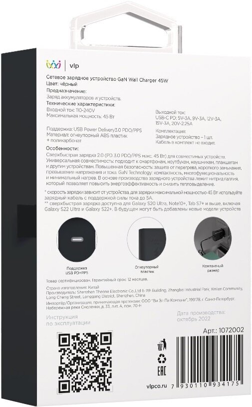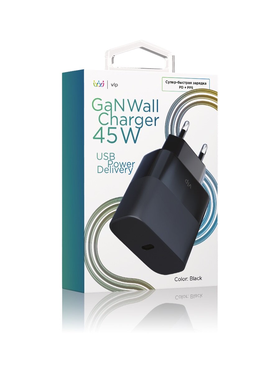 Сетевое зарядное устройство VLP GaN 45Вт USB-C PD PPS черный GaN Wall USB-C (1072002), чёрный