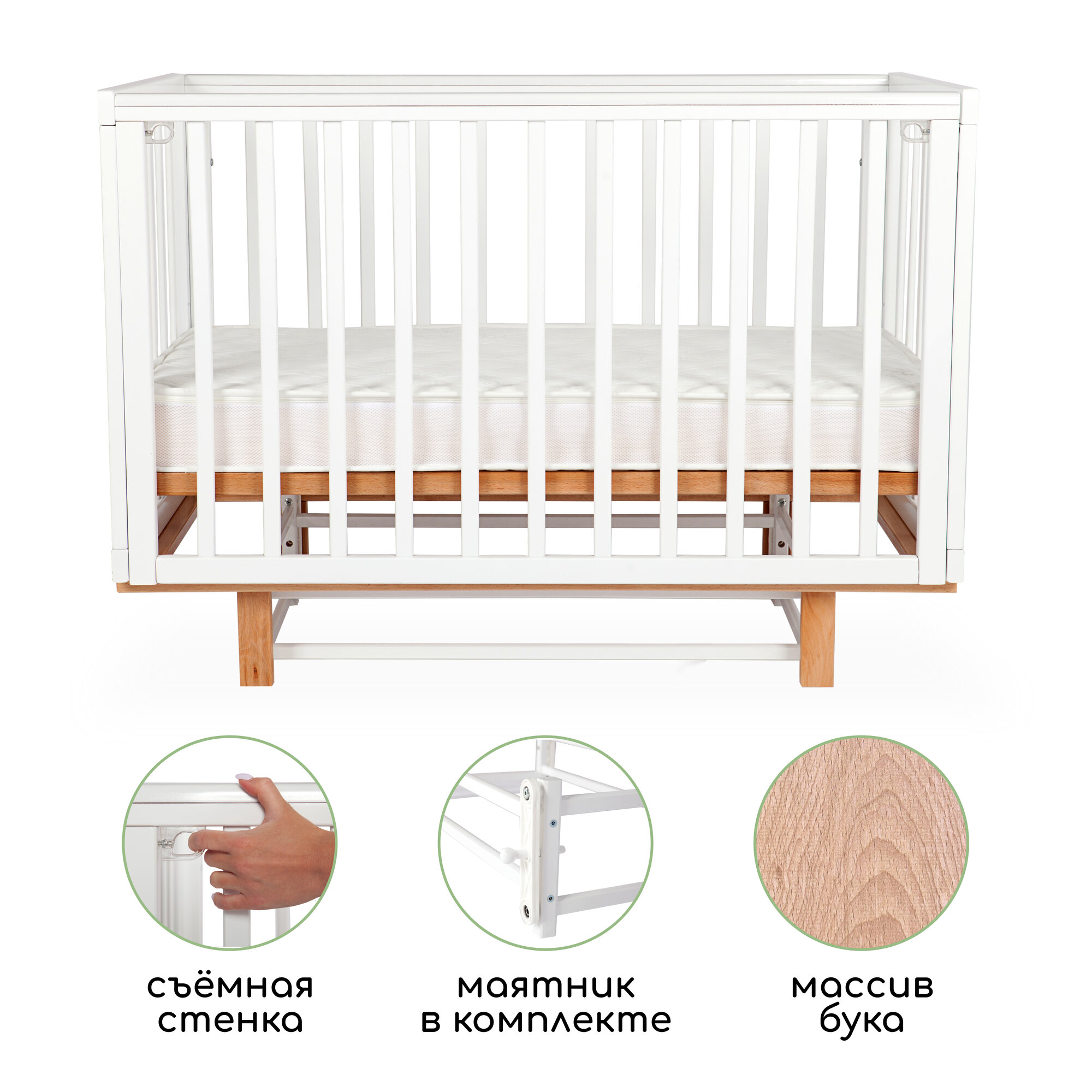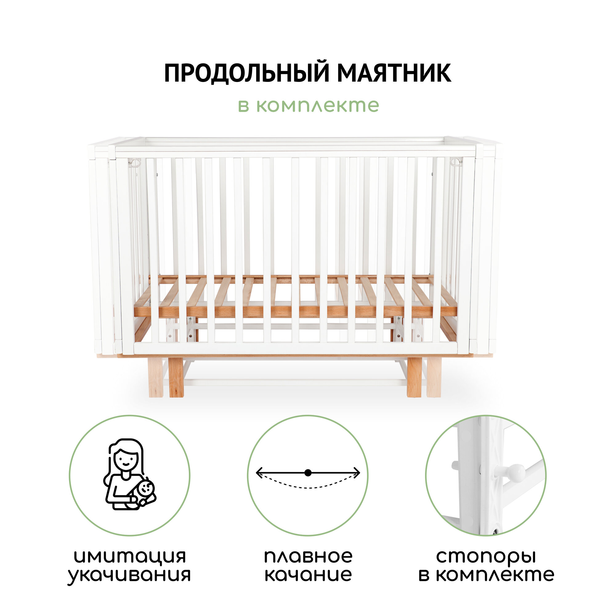 Одной из особенностей кроватки является наличие маятникового механизма, который имитирует нежное покачивание ребенка на руках матери. Этот механизм обеспечивает мягкое и плавное движение, способствуя успокоению и комфорту младенца. Кроме того, механизм оснащен стопорами, которые позволяют зафиксировать его в практически неподвижном положении. Кровать также может использоваться без маятника.