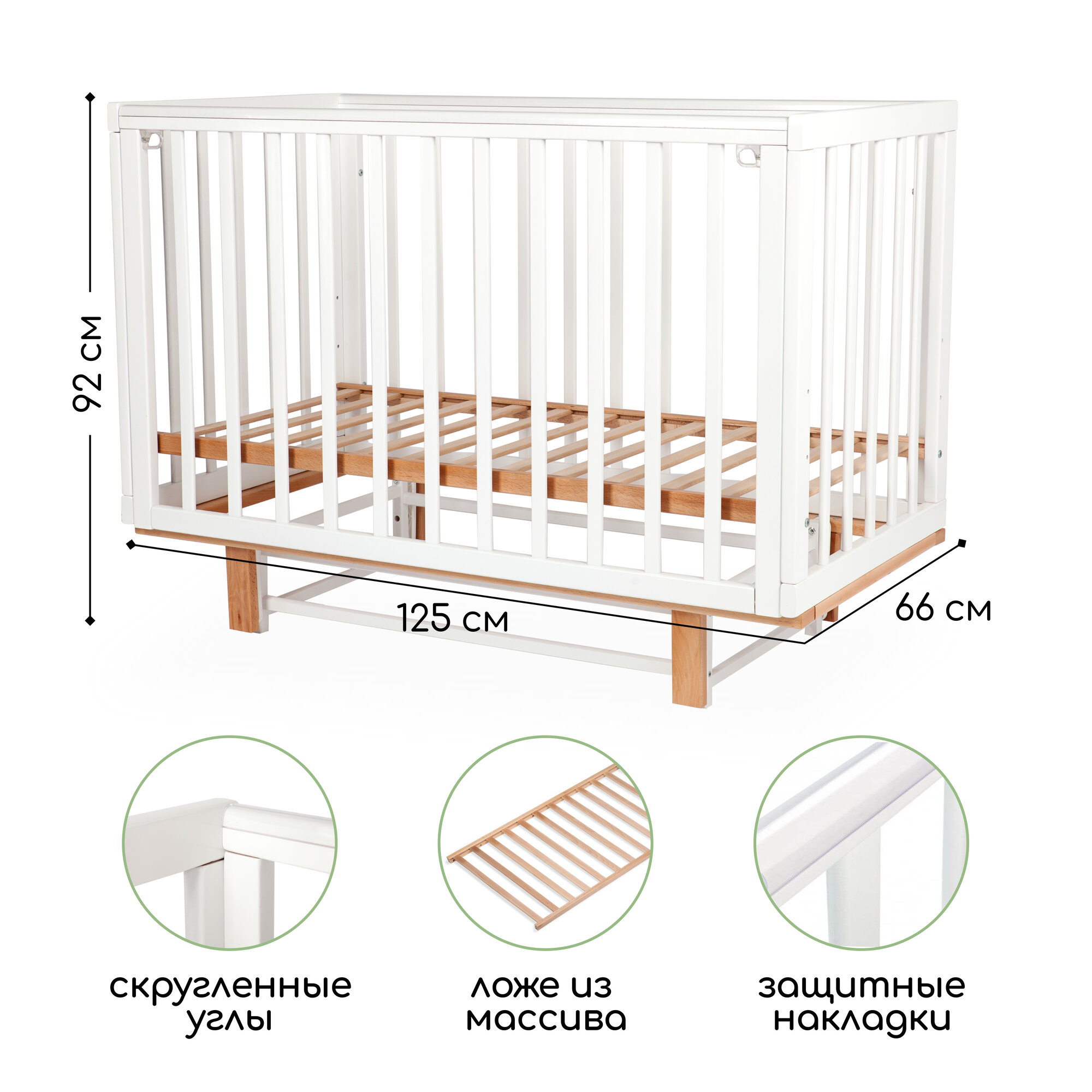 В данной модели предусмотрены пластиковые накладки на бортики, чтобы защитить зубки ребенка. Стенки и дно кровати – реечные, что создает естественную вентиляцию матраса и спального места, способствует отведению влаги.