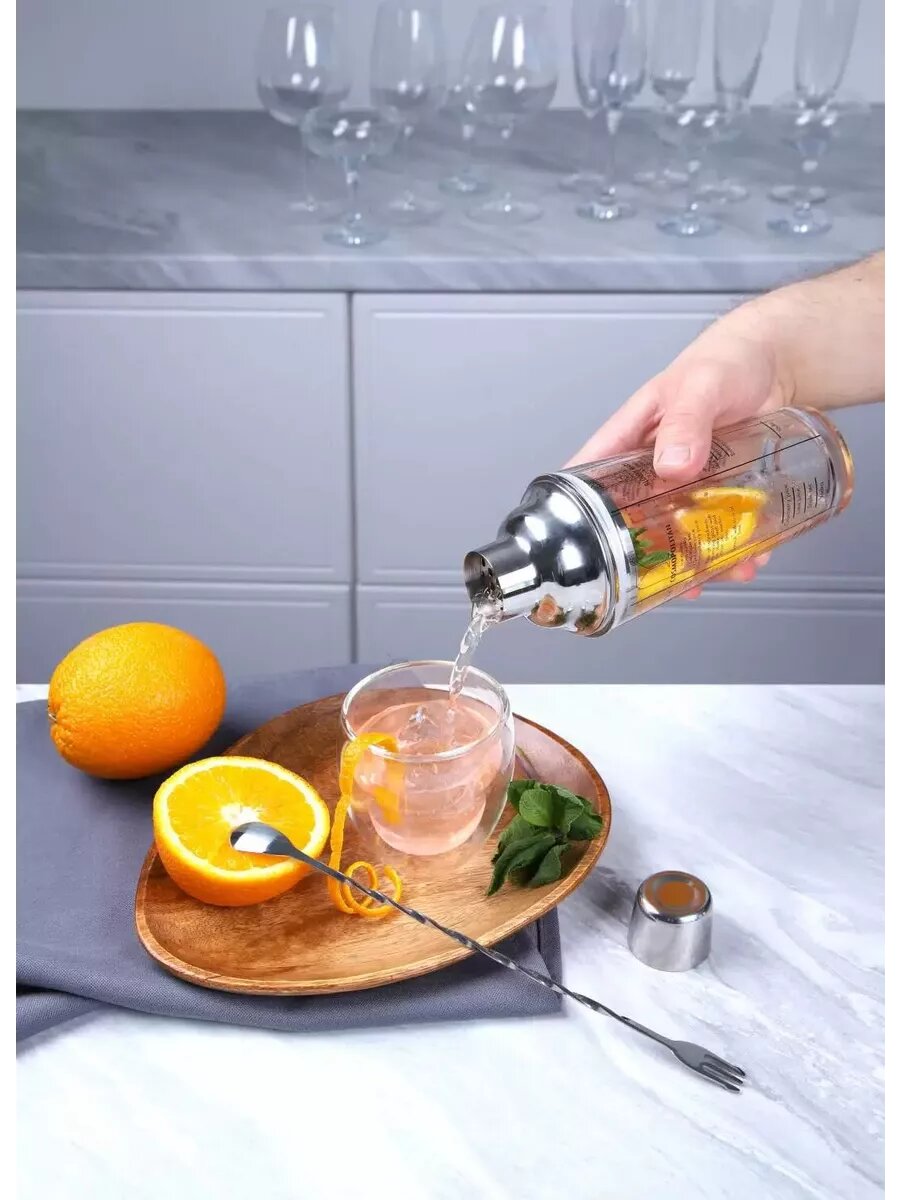 Барная ложка с мадлером - это универсальный аксессуар 2 в 1. С помощью ложки вы можете перемешивать ингредиенты в высоких бокалах или кувшинах. Функциональная вилка пригодится для извлечения фруктов и ягод из высоких емкостей. Ручка в форме спирали сделана специально для аккуратного добавления ингредиентов при приготовлении многослойных коктейлей. Такая барная ложка с вилкой станет универсальным аксессуаром для домашнего бара и для кухни. Изделие выполнено из нержавеющей стали 18/10. Длина: 26 см. Барную ложку Cocktail можно мыть в посудомоечной машине.