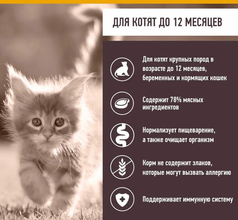 - Котенок ест с удовольствием. Наедается. Корм сытный. Аллергии не вызвал.