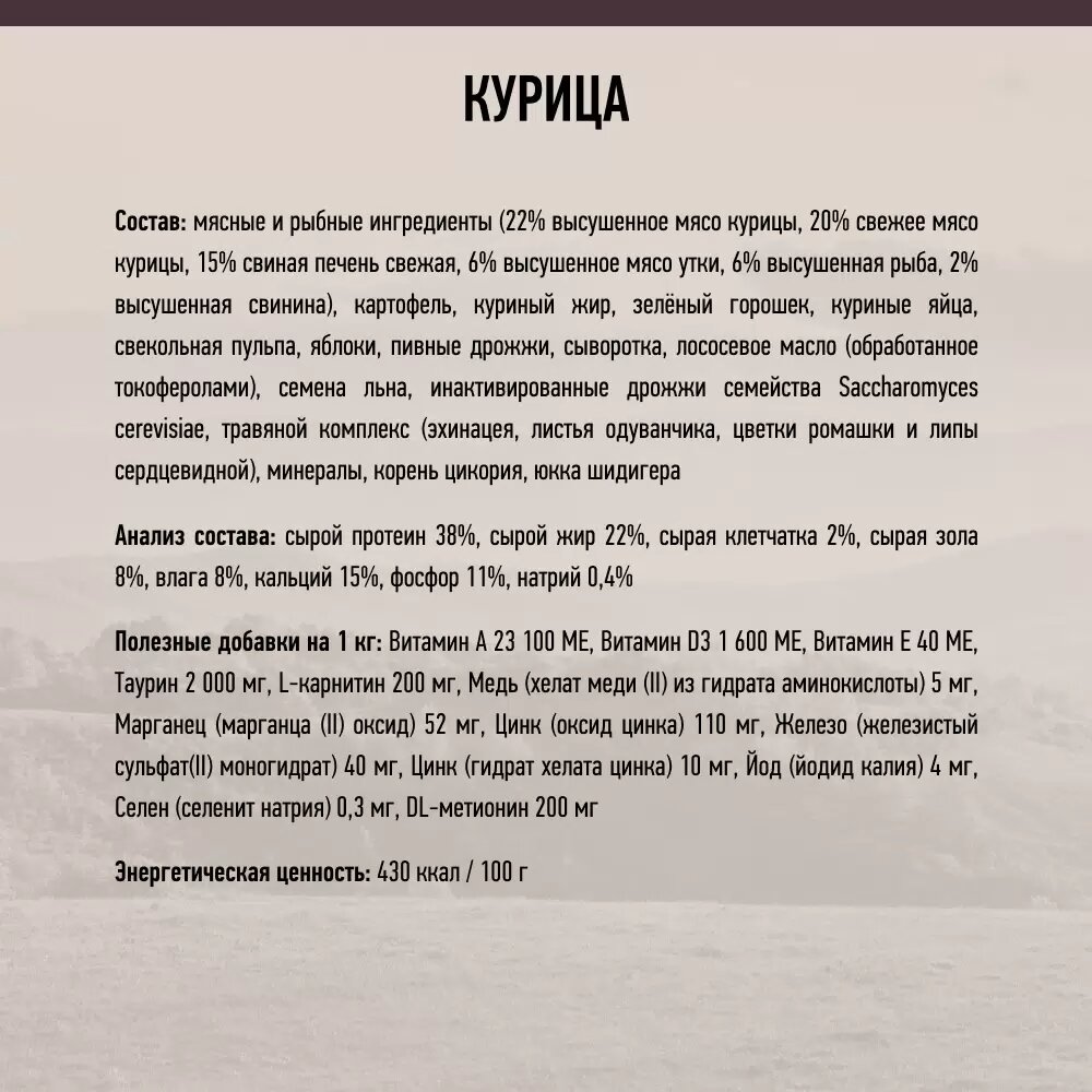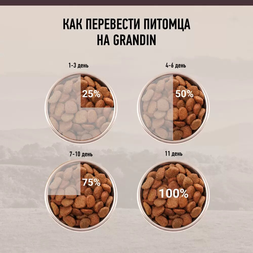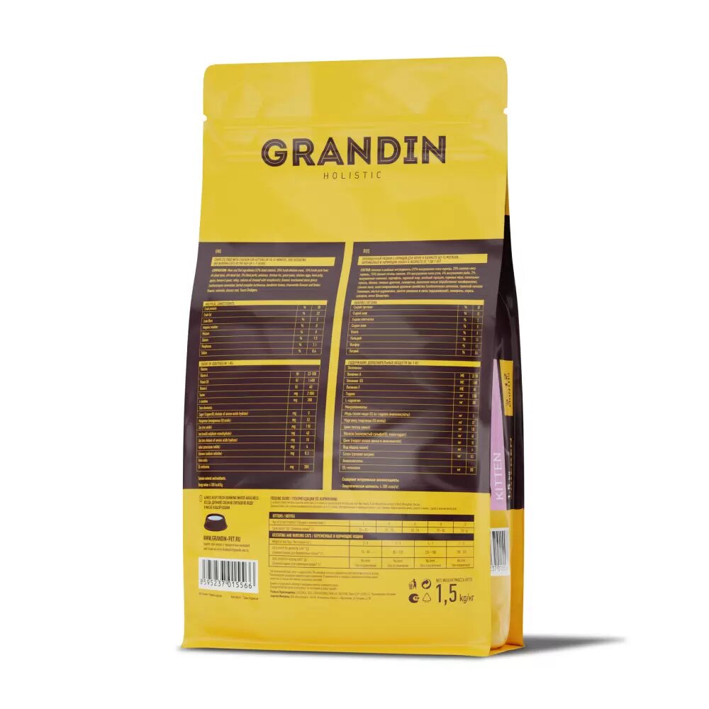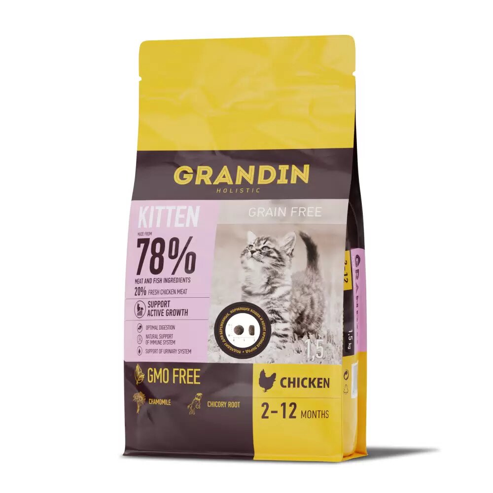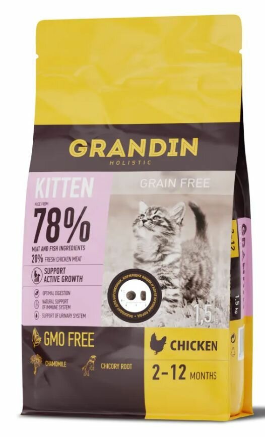 GRANDIN Holistic Kitten — это полноценный сбалансированный рацион c курицей для котят в возрасте до 12 месяцев, беременных и кормящий кошек. Корм на основе свежего мяса, содержит все необходимые макро- и микроэлементы для здорового роста и развития молодого питомца.Преимущества:Корм не содержит злаков, снижая таким образом риск аллергических реакций.Большое содержание мяса, из которого до 20% свежее мясо курицы.Высокий уровень протеина для роста мышечной ткани.Мясо курицы — диетический продукт с низким содержанием жира и высоким содержанием белка.Свекольная пульпа — натуральный пребиотик и источник клетчатки, способствующий нормализации пищеварительного процесса.Кальций и фосфор для правильного формирования скелета.Таурин — поддерживает работу сердца, нервной системы, головного мозга и зрения.Комплекс витаминов для поддержания жизнедеятельности котёнка.Юкка Шидигера нормализует процесс пищеварения, улучшает всасывание питательных веществ, очищает организм.Эхинацея способствует укреплению иммунитета и улучшению обмена веществ.