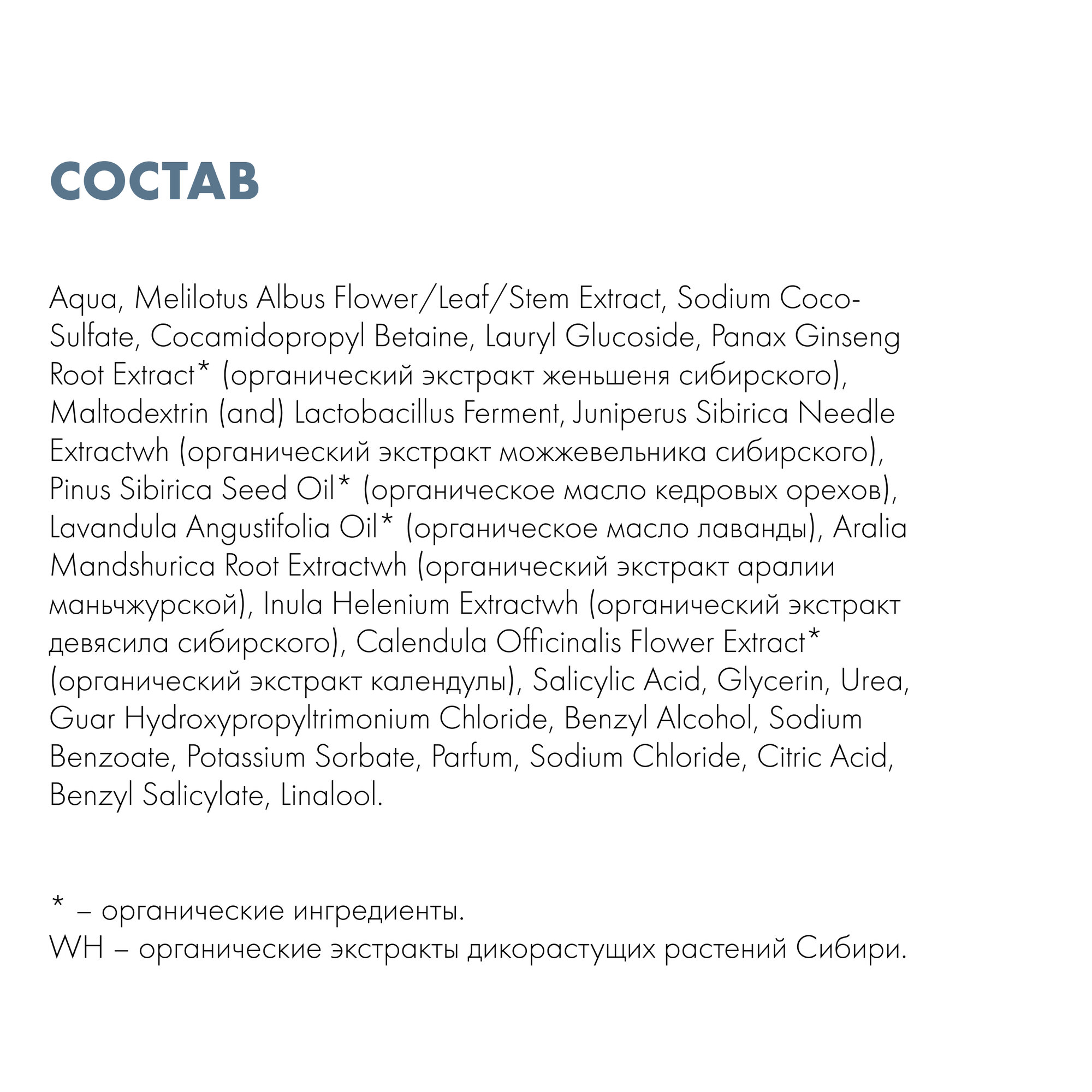 Форма выпуска и упаковка Шампунь для волос - 400 сл, флаконСостав Aqua, Melilotus Albus Flower/Leaf/Stem Extract, Sodium Coco-Sulfate, Cocamidopropyl Betaine, Lauryl Glucoside, Panax Ginseng Root Extract* (органический экстракт женьшеня сибирского), Maltodextrin (and) Lactobacillus Ferment, Juniperus Sibirica Needle Extractwh (органический экстракт можжевельника сибирского), Pinus Sibirica Seed Oil* (органическое масло кедровых орехов), Lavandula Angustifolia Oil* (органическое масло лаванды), Aralia Mandshurica Root Extractwh (органический экстракт аралии маньчжурской), Inula Helenium Extractwh (органический экстракт девясила сибирского), Calendula Officinalis Flower Extract* (органический экстракт календулы), Salicylic Acid, Glycerin, Urea, Guar Hydroxypropyltrimonium Chloride, Benzyl Alcohol, Sodium Benzoate, Potassium Sorbate, Parfum, Sodium Chloride, Citric Acid, Benzyl Salicylate, Linalool. (*) - органические ингредиенты. (WH) - органические экстракты дикорастущих растений Сибири.Описание Бренд Natura Siberica - первый российский бренд качественной органической косметики. Natura Siberica использует удивительные свойства сибирских трав и растений, чтобы передать всю их силу для сохранения молодости и красоты кожи и волос. Все травы, на которых основана косметика, собираются вручную. Линия ICE PROFESSIONAL (Айс Профешнл) - профессиональный подход к красоте! Специалисты компании Natura Siberica объединяют силу сибирских растений и инновационные разработки, чтобы у вас не оставалось сомнений в выборе ухода для волос. Секрет эффективности продуктов ICE PROFESSIONAL by Natura Siberica в исключительных свойствах био-вытяжек (биоплазмы) сибирских растений, полученных собственным запатентованным методом крио-ферментативной экстракции. Высококачественные рецептуры, соблазнительные текстуры, чарующие ароматы, изящный дизайн упаковки - всё это ICE PROFESSIONAL. ICE BY NATURA SIBERICA HAIR GROWTH шампунь стимулирующий РОСТ волос - бережно очищает кожу головы и волосы, поддерживает свежесть в течение дня. Способствует ускорению роста волос и укреплению волосяных луковиц. активные ингредиенты: Сибирский женьшень регулирует работу сальных желез и способствует ускорению роста волос. Пробиотики придают волосам силу, ускоряют рост, защищают от воздействия внешних факторов. профессиональный совет: во время мытья волос рекомендуем несколько минут делать массаж кожи головы, он полезен для корней волос.Показания Уход за волосами - для всех типов волос, способствует ускорению роста волос и укреплению волосяных луковиц.Противопоказания Индивидуальная непереносимость компонентов продукта. При появлении каких-либо раздражений или аллергических реакций немедленно прекратить использование.Способ применения и дозы Нанести на влажные кожу головы и волосы. Взбить в пену. Тщательно смыть. При необходимости повторить.Особые указания Меры предосторожности: при попадании.