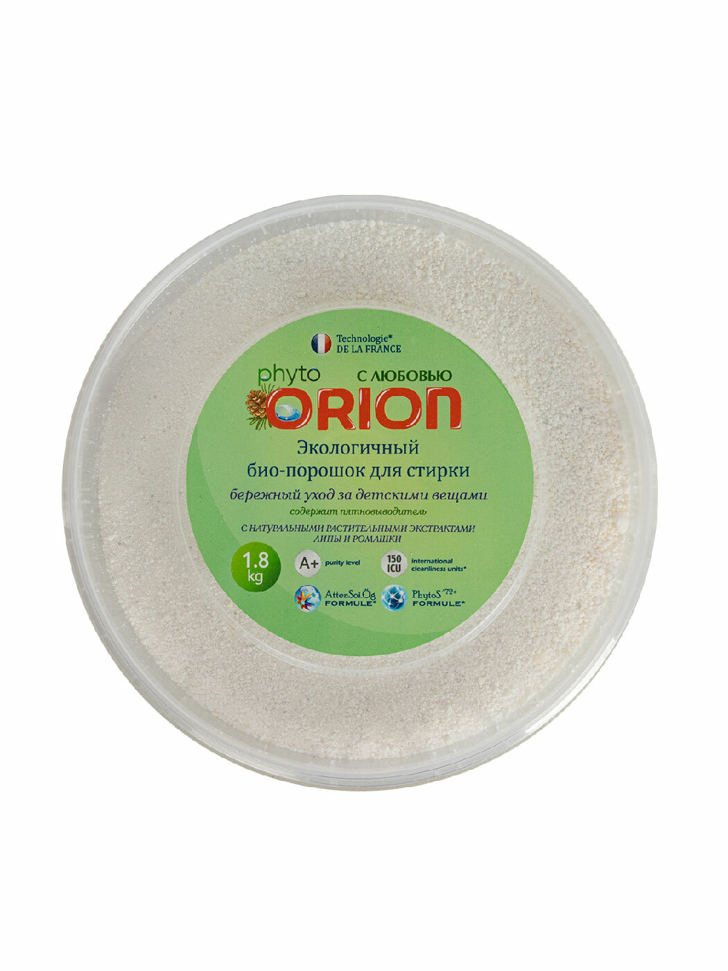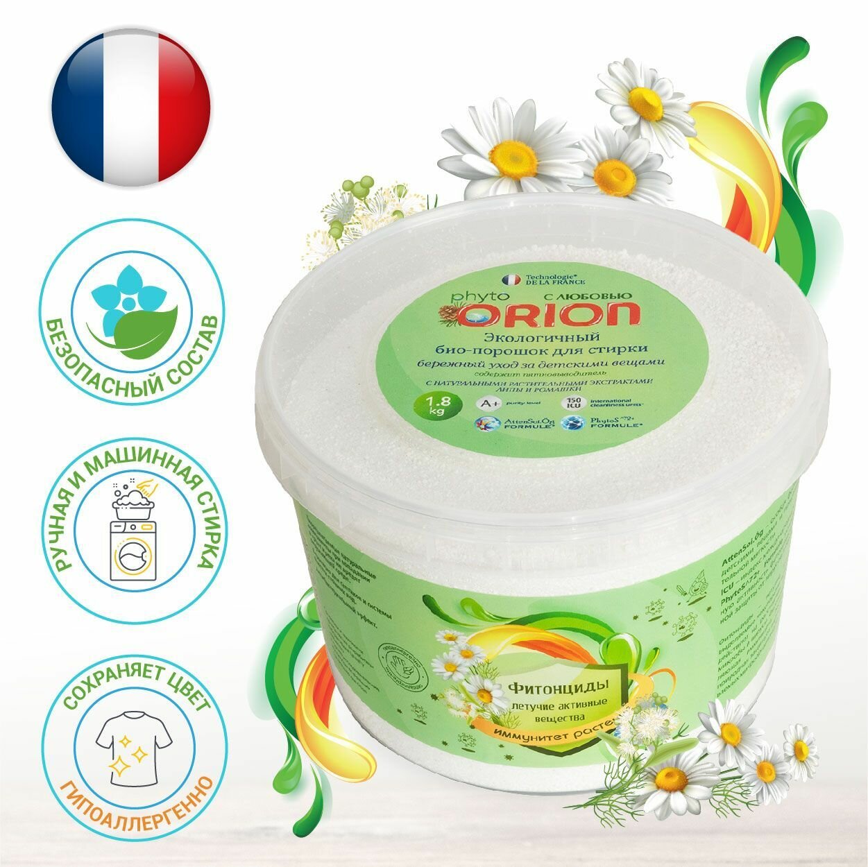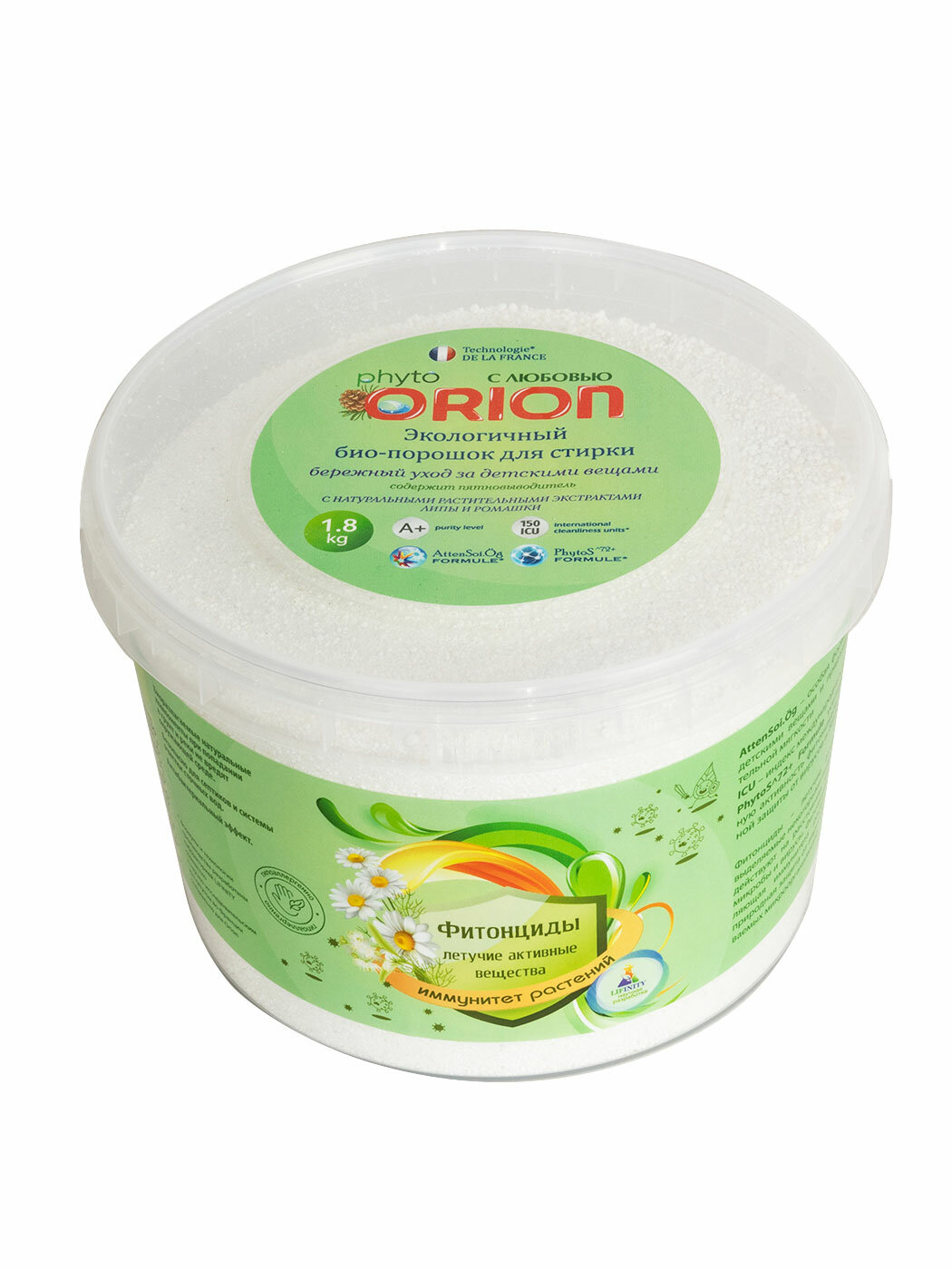 Гарантия качества напрямую от производителяНаш био-порошок собственного производства для детского белья ORION без агрессивных химических веществ с безопасной формулой обеспечит деликатный уход за одеждой вашего малыша. Специальные формулы: AttenSoi. Ög – особая формула для ухода за детскими вещами и придания им дополнительной мягкости. PhytoS^72+ Formule усиливает естественную активность фитонцидов для максимальной защиты от вирусов и бактерий. Фитонциды – летучие активные вещества, выделяемые некоторыми видами растений. Они действуют на расстоянии, уничтожая вредные микробы и вирусы. Фитонциды – важная составляющая иммунитета растений, естественная природная защита от вирусов и болезней, вызываемых микроорганизмами. Technologie DE LA FRANCE Класс чистоты А+ >150 IСU Содержит фитонциды особенности И преимущества: экологичный био-порошок для стирки с экстрактами липы и ромашки содержит пятновыводитель биоразлагаемые натуральные компоненты при попадании в грунт и реки не вредят окружающей среде безопасно для септиков и системы очистки сточных вод антибактериальный эффект для стиральной машины и ручной стирки Специально разработанный порошок для детского белья ORION с натуральными компонентами для деликатного ухода за одеждой ребенка эффективно удалит пятна и загрязнения. Безопасен для окружающей среды и водных ресурсов.