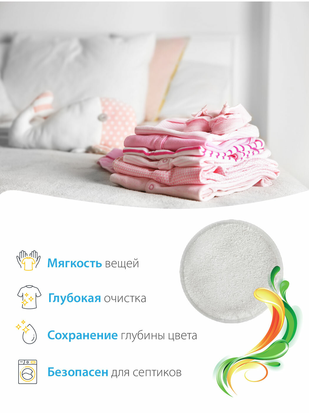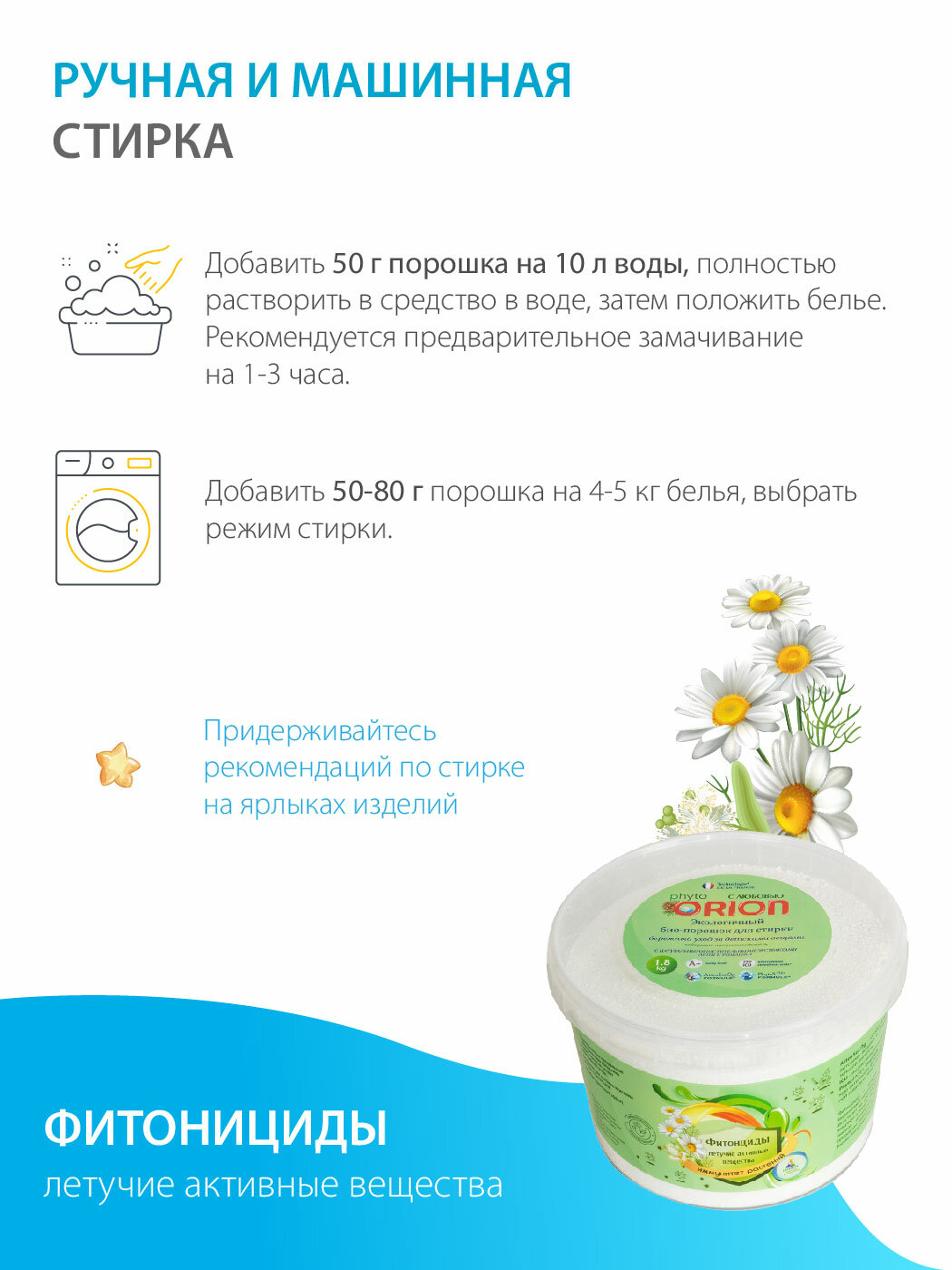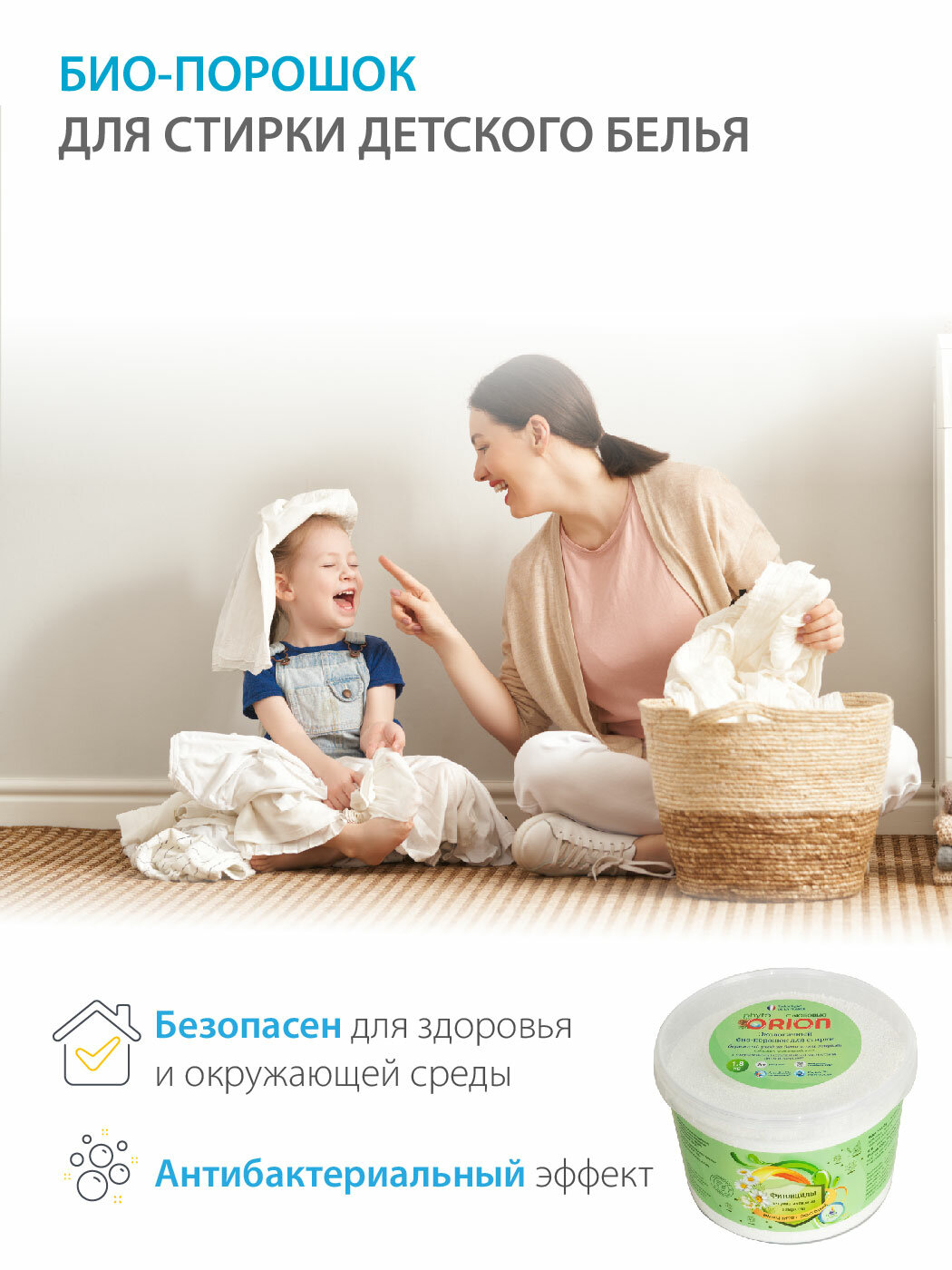 Гарантия качества напрямую от производителяНаш био-порошок собственного производства для детского белья ORION без агрессивных химических веществ с безопасной формулой обеспечит деликатный уход за одеждой вашего малыша. Специальные формулы: AttenSoi. Ög – особая формула для ухода за детскими вещами и придания им дополнительной мягкости. PhytoS^72+ Formule усиливает естественную активность фитонцидов для максимальной защиты от вирусов и бактерий. Фитонциды – летучие активные вещества, выделяемые некоторыми видами растений. Они действуют на расстоянии, уничтожая вредные микробы и вирусы. Фитонциды – важная составляющая иммунитета растений, естественная природная защита от вирусов и болезней, вызываемых микроорганизмами. Technologie DE LA FRANCE Класс чистоты А+ >150 IСU Содержит фитонциды особенности И преимущества: экологичный био-порошок для стирки с экстрактами липы и ромашки содержит пятновыводитель биоразлагаемые натуральные компоненты при попадании в грунт и реки не вредят окружающей среде безопасно для септиков и системы очистки сточных вод антибактериальный эффект для стиральной машины и ручной стирки Специально разработанный порошок для детского белья ORION с натуральными компонентами для деликатного ухода за одеждой ребенка эффективно удалит пятна и загрязнения. Безопасен для окружающей среды и водных ресурсов.