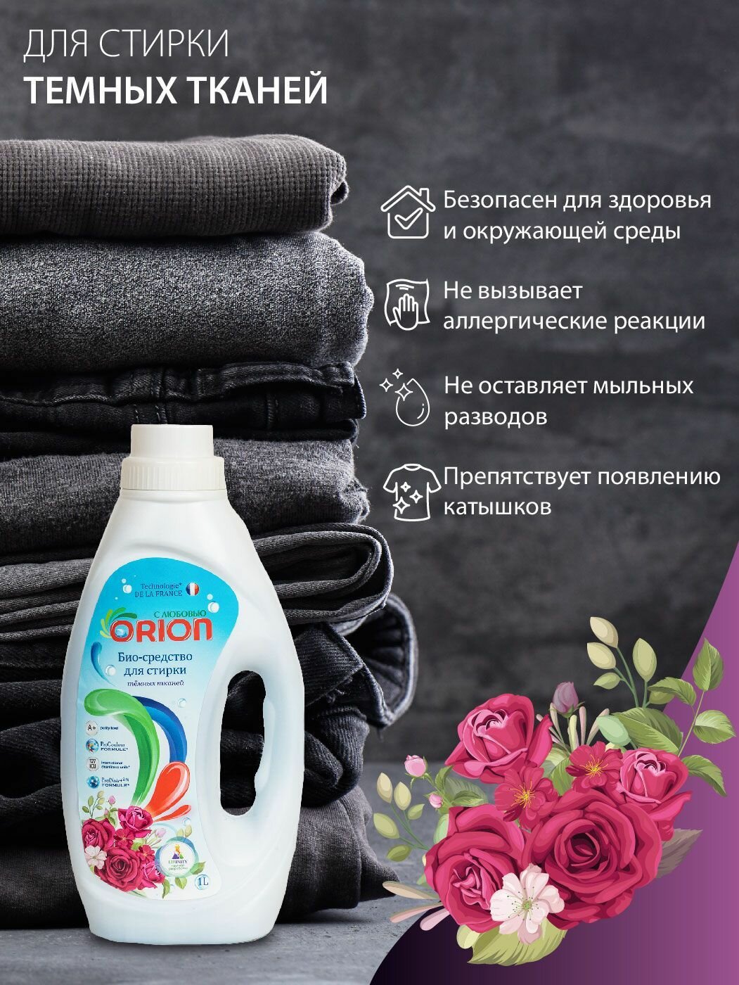 Современный биогель Orion собственного производства предназначен для эффективной и бережной стирки черных и темных тканей. Оно не повреждает структуру ткани и надолго сохраняет первоначальную интенсивность цвета даже после десятка стирок. Прекрасно растворяется в воде и великолепно отстирывает самые различные загрязнения. Специальные формулы: ProCouleur FORMULE – базовая формула защиты ткани от потери цвета ProfNoir+2.4ÿ FORMULE – специальная формула восстановления насыщенности темных цветов Technologie DE LA FRANCE Класс чистоты А+ >127 IСU особенности И преимущества: Биогель для стирки темных тканей Базовая формула защиты ткани от потери цвета Специальная формула восстановления насыщенности темных цветов Безопасно для здоровья и окружающей среды Глубокая очистка Полностью вымывается из ткани Экономичный расход Подходит для ручной и машинной стирки Гель для стирки темных тканей бережно и эффективно устраняет загрязнения и заботиться о прочности структуры тканей. Специальные формулы не только бережно отстирывает загрязнения и предотвращает потерю цвета, но и восстанавливает насыщенность темных цветов.