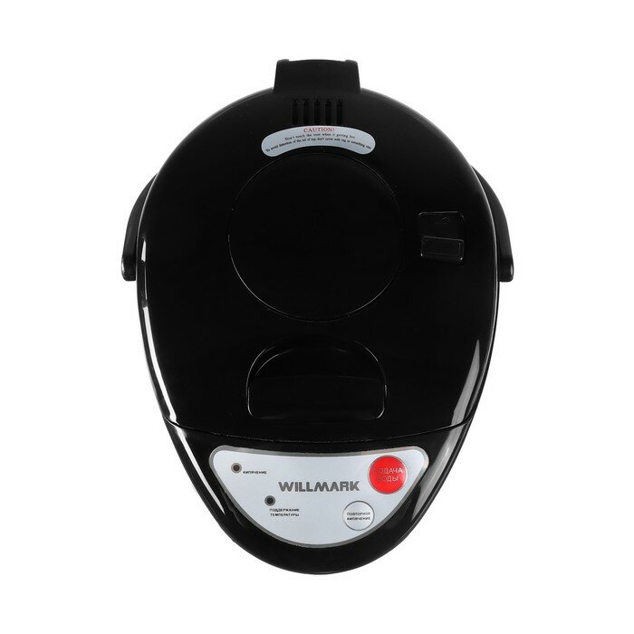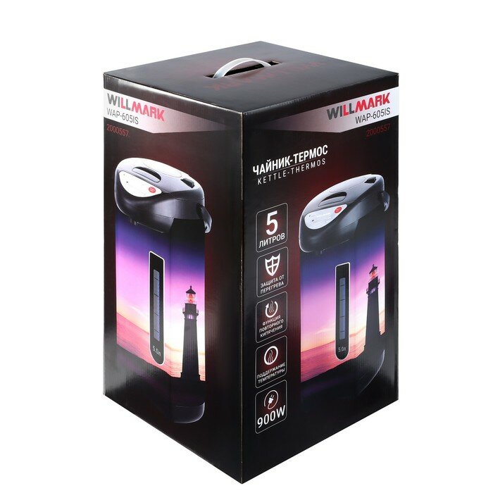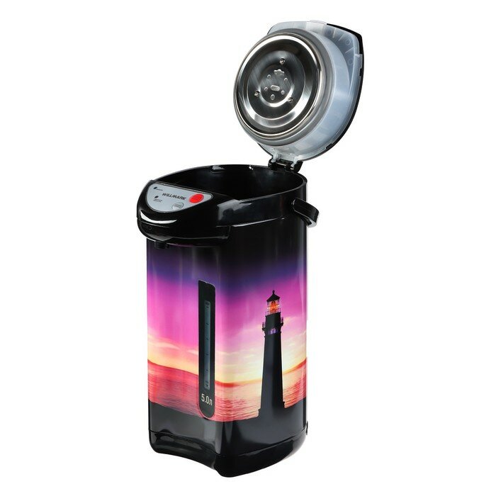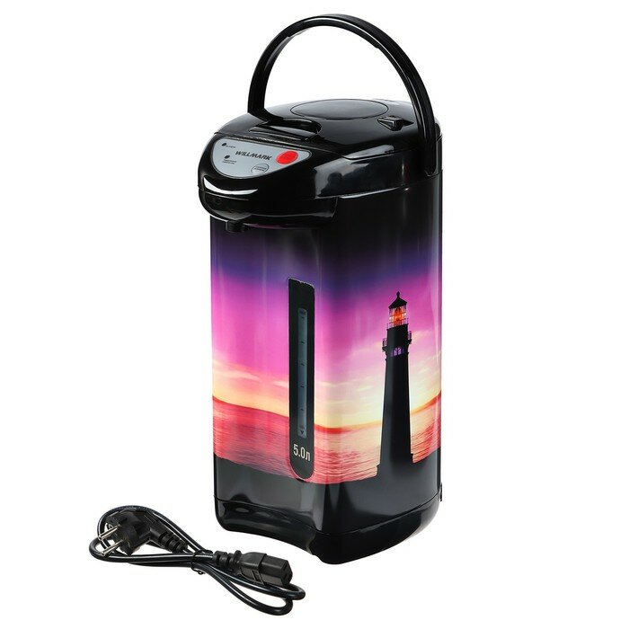 Термопот WILLMARK маяк. Чайник-термос WILLMARK бытовой электрический прибор, сочетающий в себе функции электрочайника и термоса. На данной модели установлен нижний нагревательный элемент мощностью 900 Ватт, который несомненно увеличит срок службы поттера. Прибор обладает увеличенным сроком гарантии, который составляет 2 года! Температура кипячения 100 градусов Цельсия, поддержание температуры 85 градусов Цельсия. Внешний корпус с оригинальным стильным рисунком выполнен из чёрного пластика и нержавеющей стали. На передней панели установлена стильная шкала с минимальными и максимальными обозначениями уровня воды в приборе. Ёмкость для нагрева воды из нержавеющей стали объемом 5,0 литров. В верхней части корпуса расположена крышка с отверстием для выпуска пара при кипячении, а также хромированная оригинального дизайна кнопка, нажатием на которую открывается сама крышка. Сама крышка съёмная, для удобства чистки прибора. Чайник-термос снабжён пластиковой ручкой для удобства переноса.